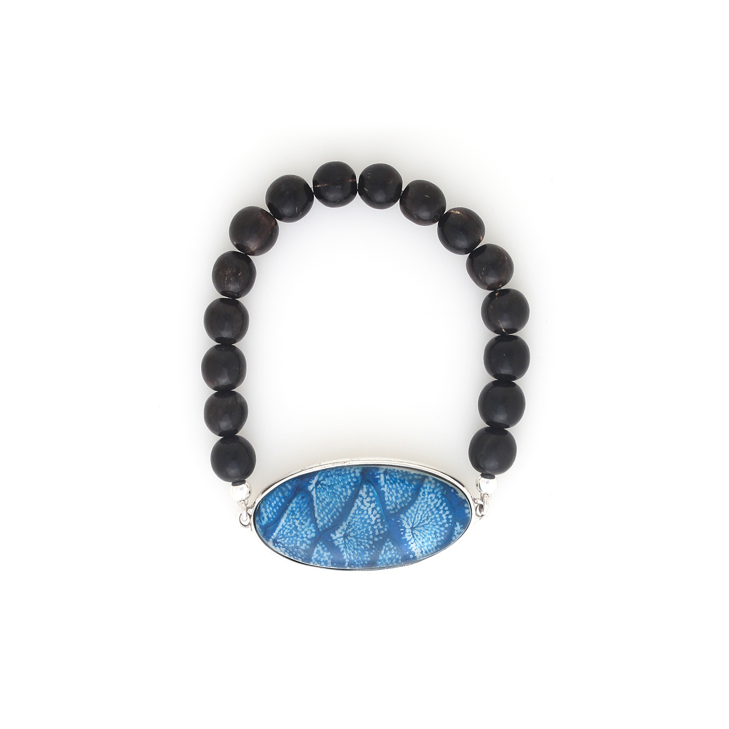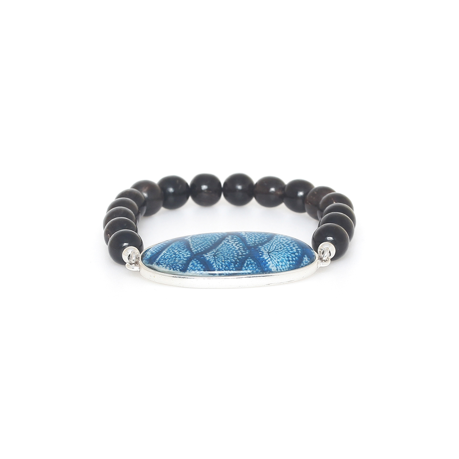 ფრანგული ბრენდი Nature Bijoux ს ხელნაკეთი სამაჯური, კოლექციიდან CORFOU. სამკაულის ბაზად გამოყენებულია თითბერი, კოლექციაში გამოყენებული ნატურალური მასალები და ქვები: ფალავანის დედა მარგალიტი,ბამბის ძაფი, რქა, თევზის ტყავი, თითბერი.