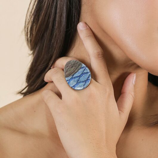 ფრანგული ბრენდი Nature Bijoux ს ხელნაკეთი ბეჭედი, კოლექციიდან CORFOU. სამკაულის ბაზად გამოყენებულია თითბერი, კოლექციაში გამოყენებული ნატურალური მასალები და ქვები: ფალავანის დედა მარგალიტი,ბამბის ძაფი, რქა, თევზის ტყავი, თითბერი.
