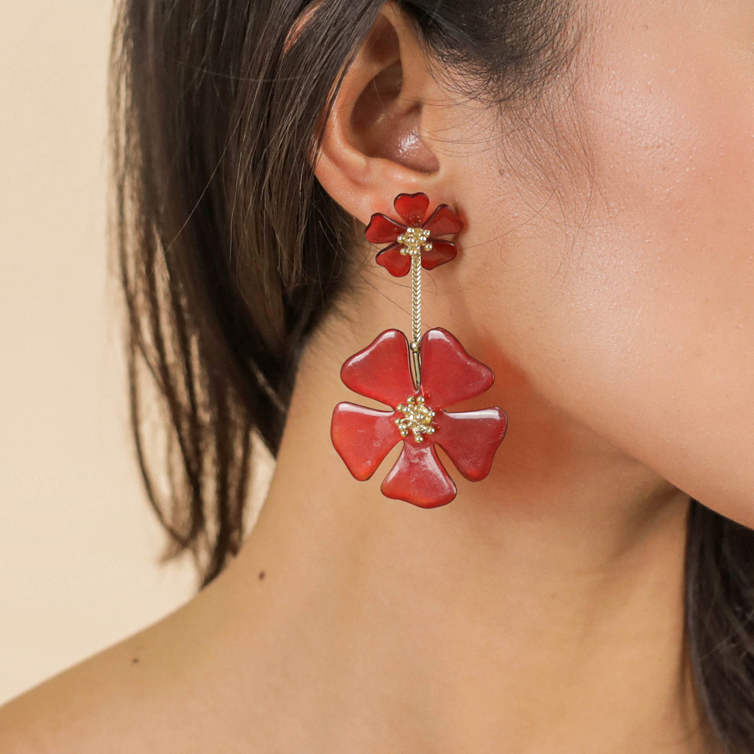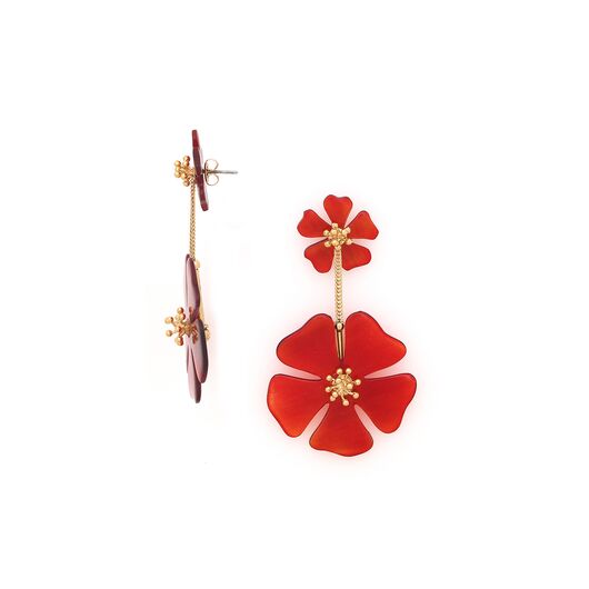 ფრანგული ბრენდი Nature Bijoux ს ხელნაკეთი საყურე, კოლექციიდან HIBISCUS. სამკაულის ბაზად გამოყენებულია თითბერი, კოლექციაში გამოყენებული ნატურალური მასალები და ქვები: რქა, ოქროსფერი სადაფი.