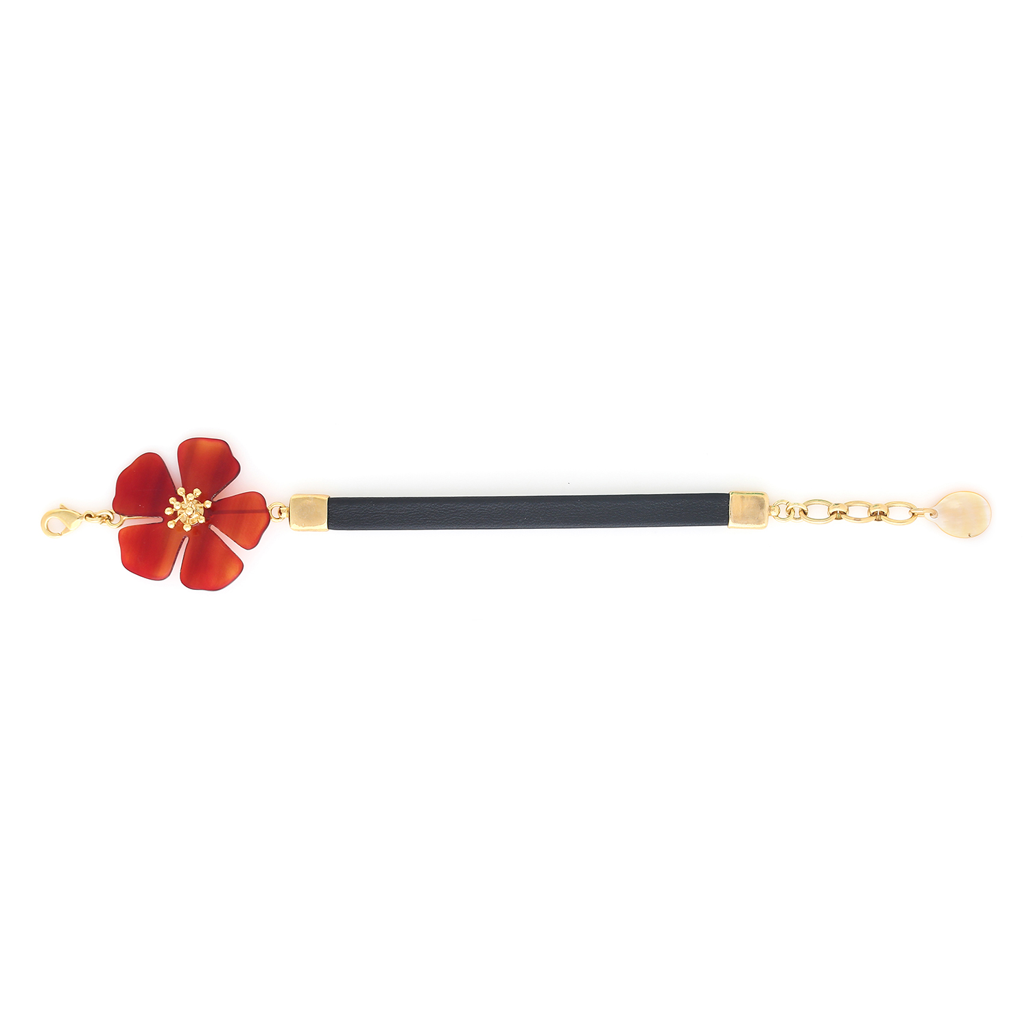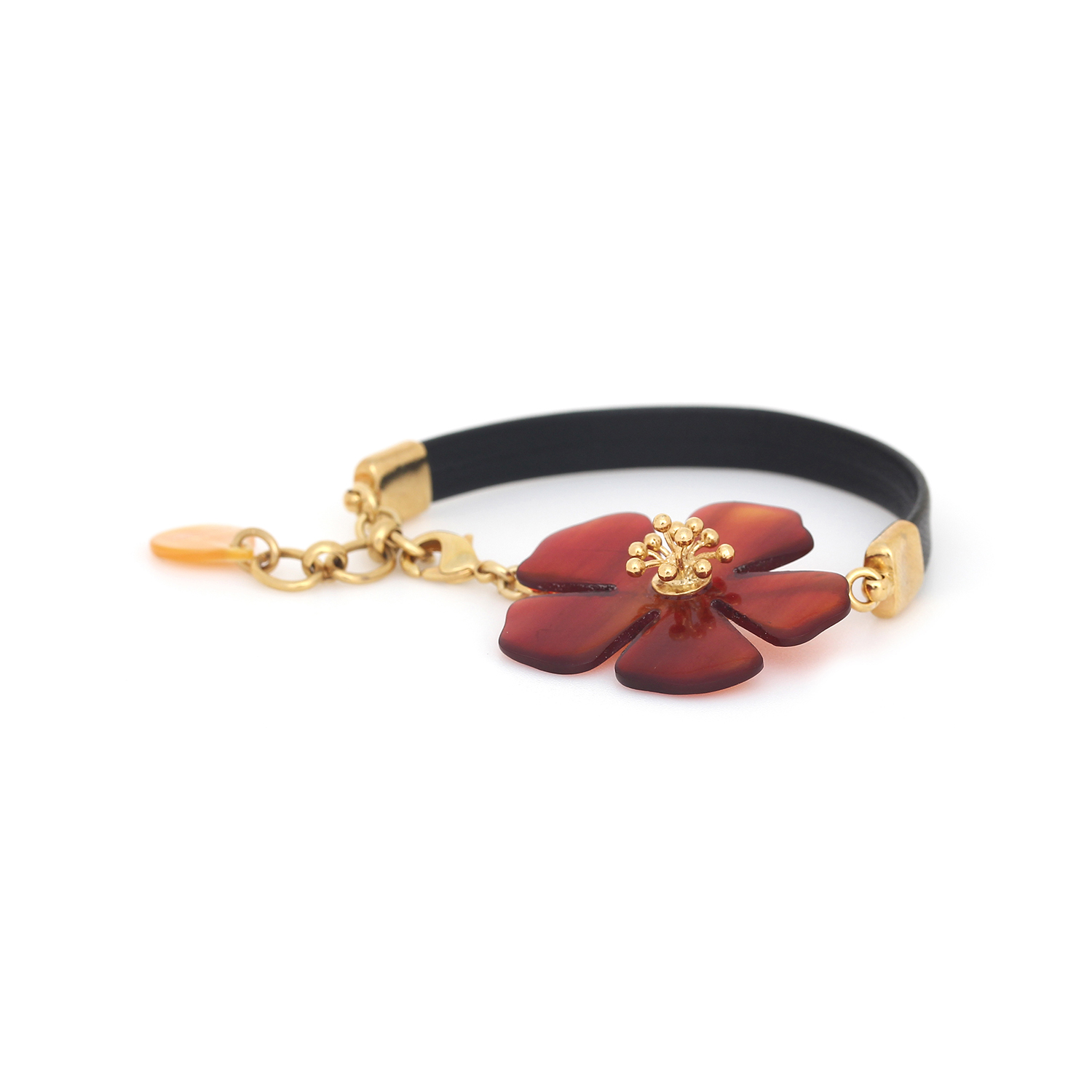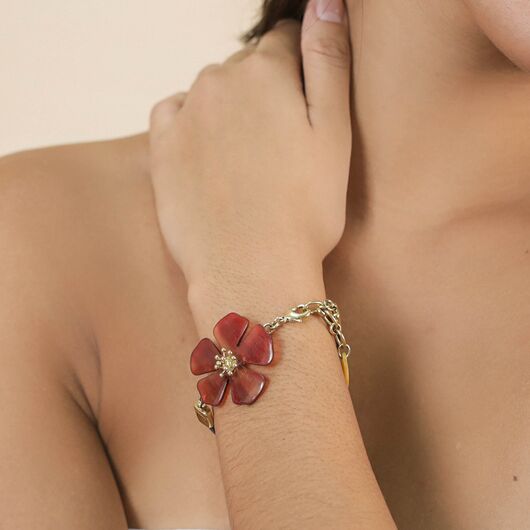 ფრანგული ბრენდი Nature Bijoux ს ხელნაკეთი სამაჯური, კოლექციიდან HIBISCUS. სამკაულის ბაზად გამოყენებულია თითბერი, კოლექციაში გამოყენებული ნატურალური მასალები და ქვები: რქა, ოქროსფერი სადაფი.