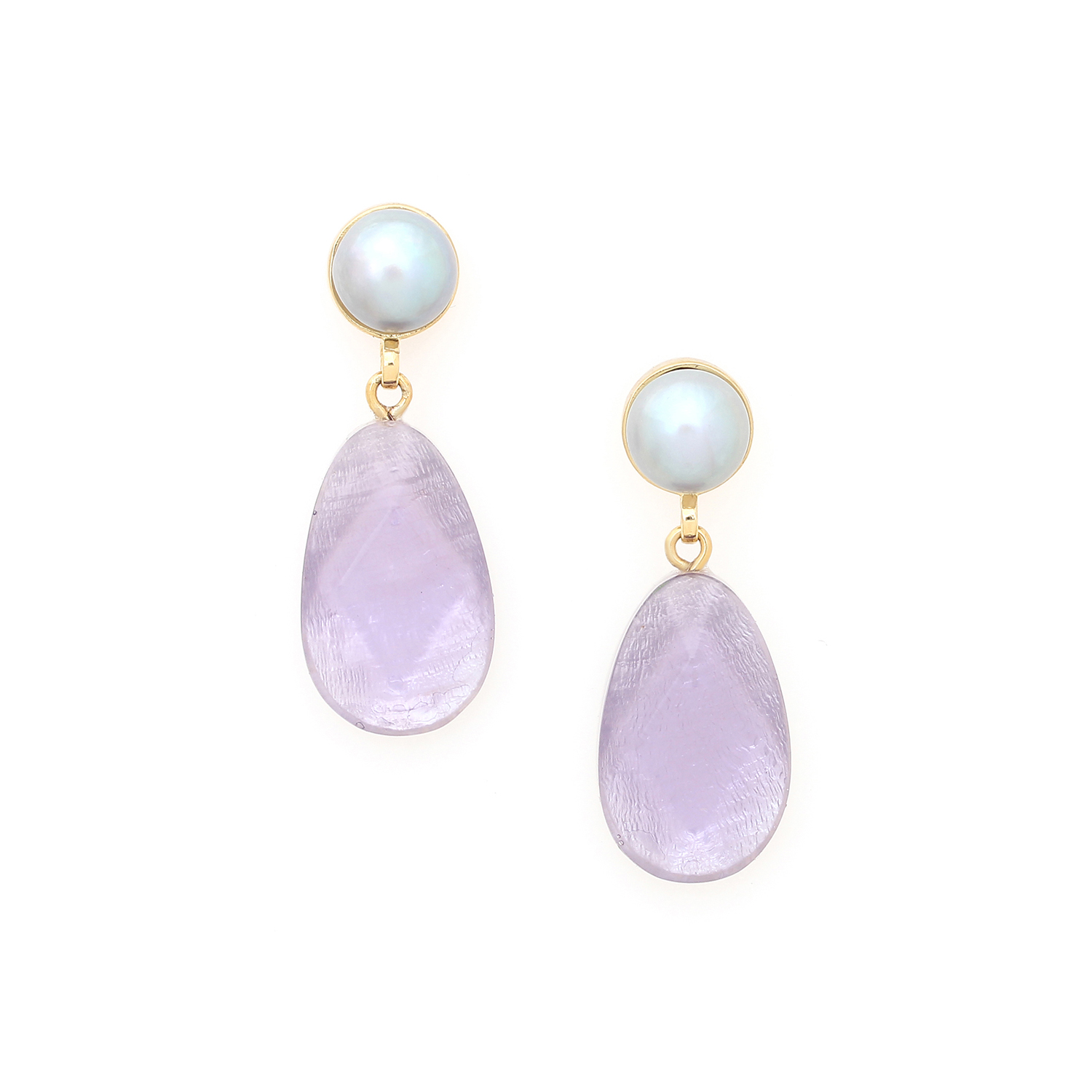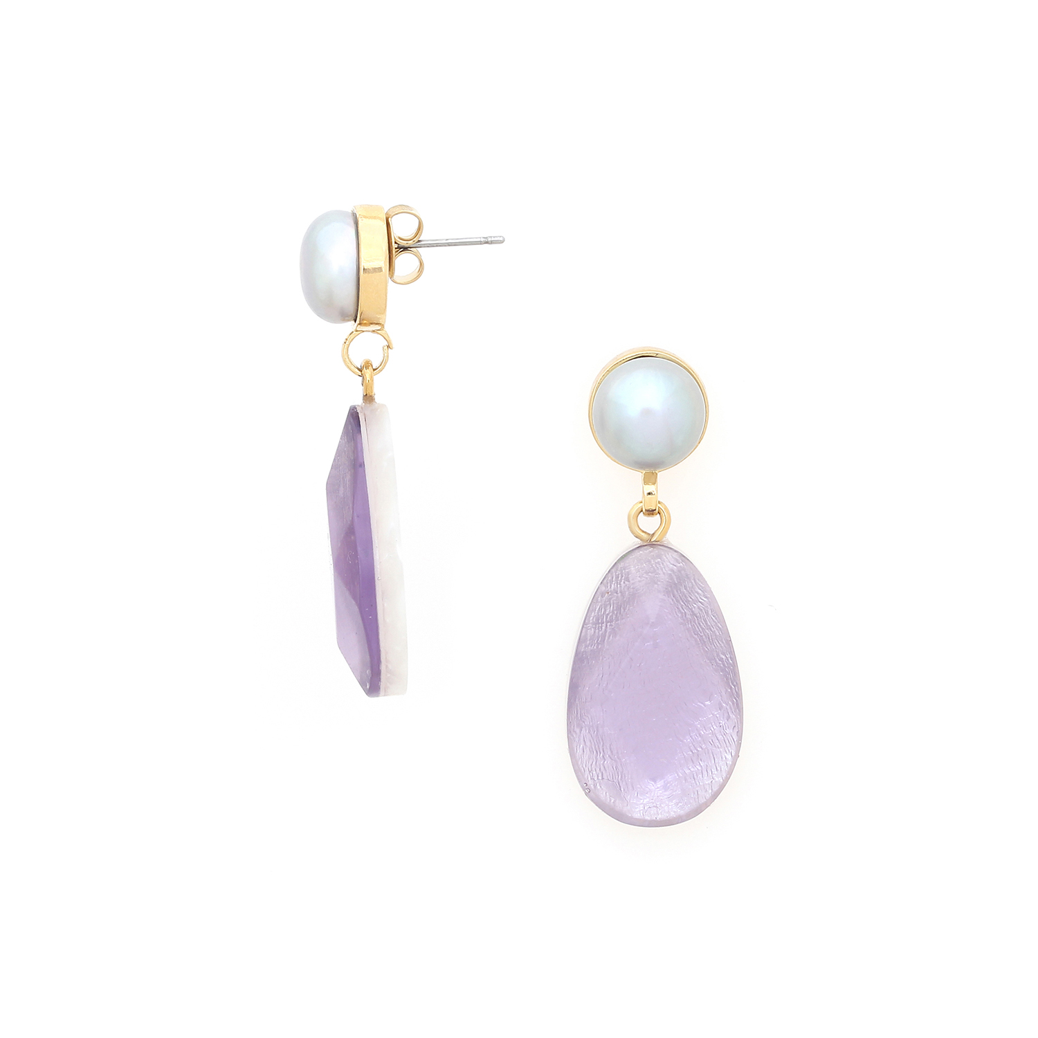 ფრანგული ბრენდი Nature Bijoux ს ხელნაკეთი საყურე, კოლექციიდან LAVENDER. სამკაულის ბაზად გამოყენებულია თითბერი, კოლექციაში გამოყენებული ნატურალური მასალები და ქვები: დამუშავებული მინა, ბამბის ძაფი, მარგალიტი, ნაცრისფერი აბაზონის ხე, ლაბრადორიტი, თითბერი.