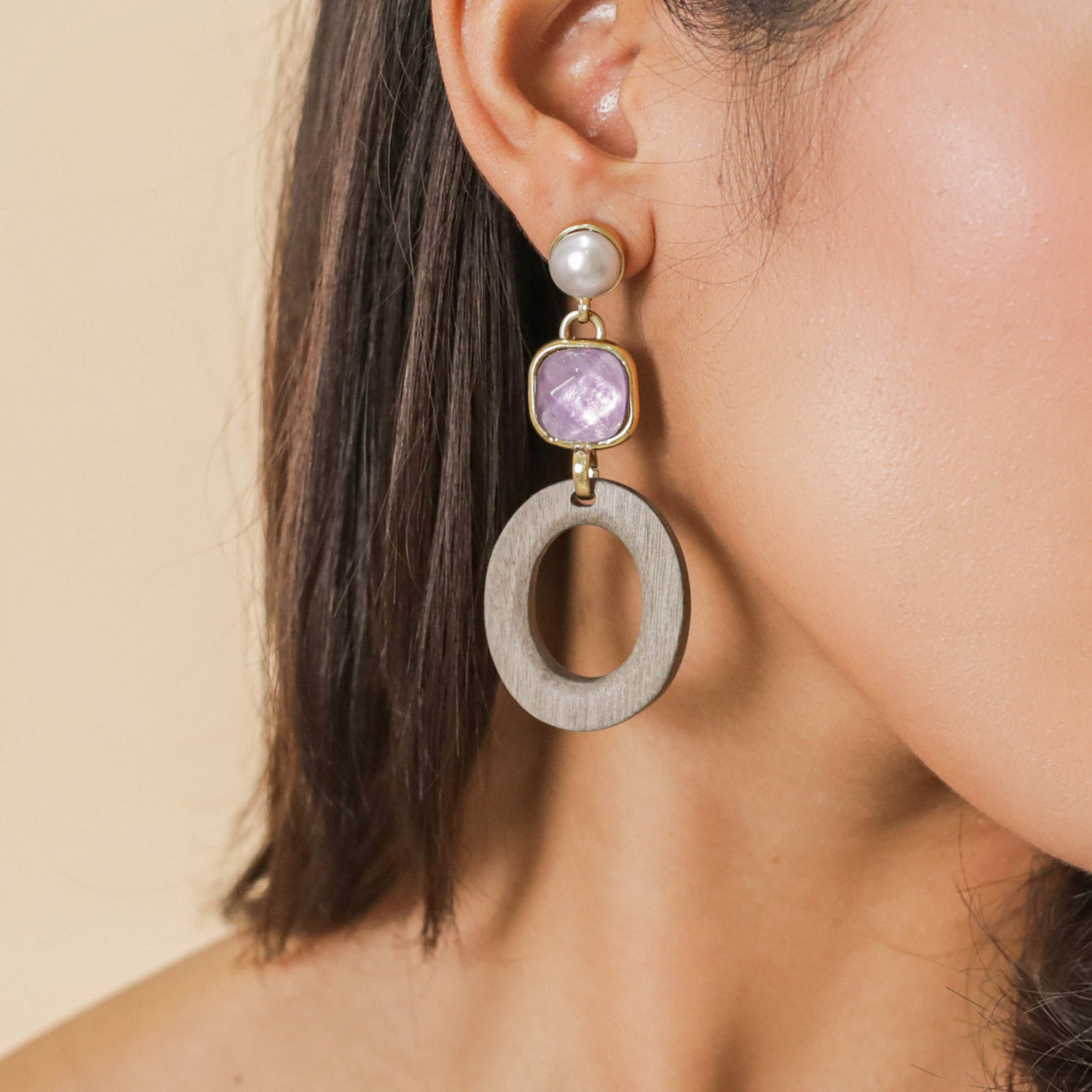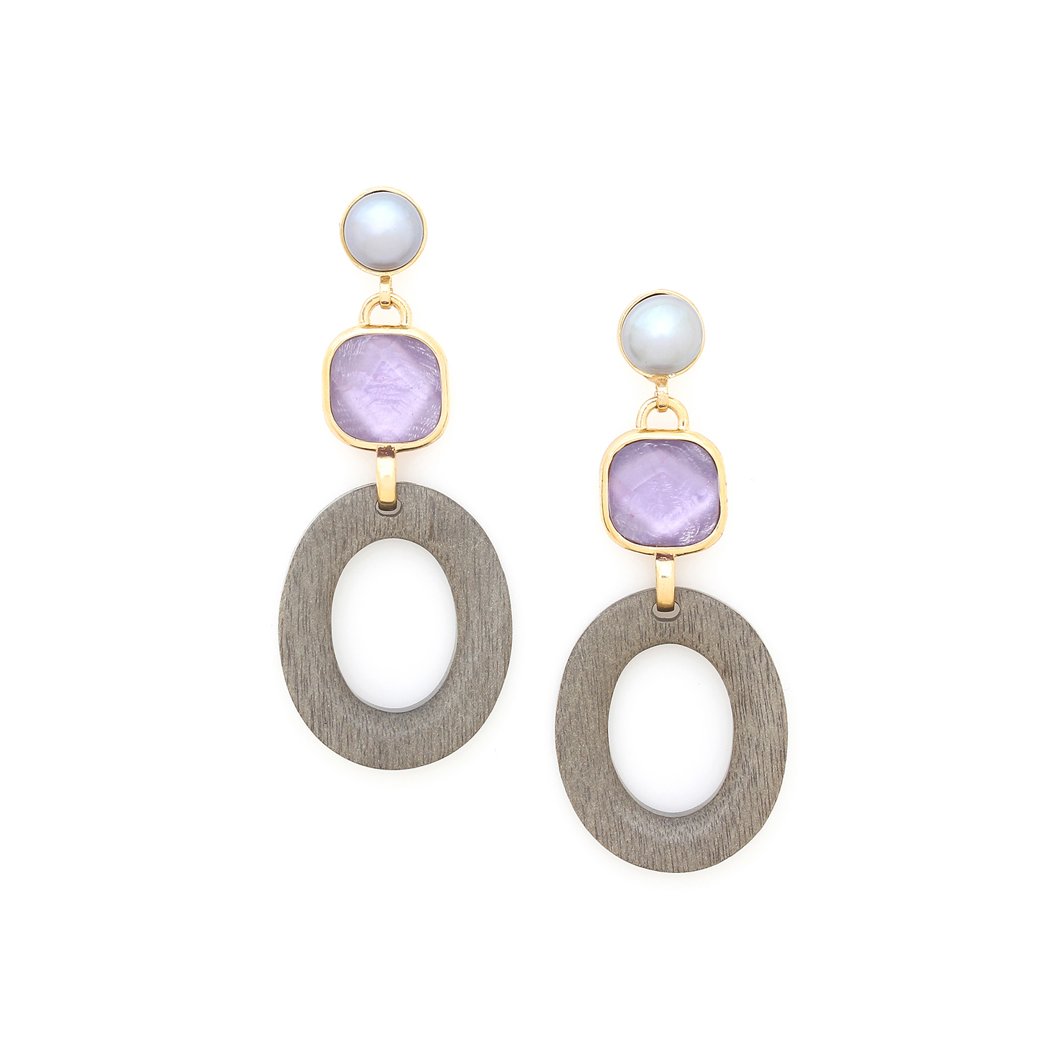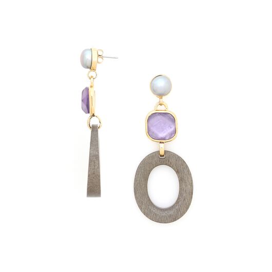ფრანგული ბრენდი Nature Bijoux ს ხელნაკეთი საყურე, კოლექციიდან LAVENDER. სამკაულის ბაზად გამოყენებულია თითბერი, კოლექციაში გამოყენებული ნატურალური მასალები და ქვები: დამუშავებული მინა, ბამბის ძაფი, მარგალიტი, ნაცრისფერი აბაზონის ხე, ლაბრადორიტი, თითბერი.