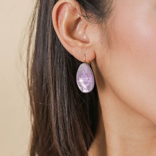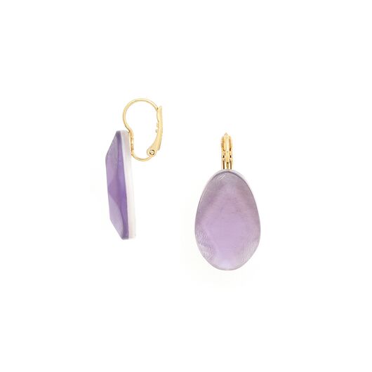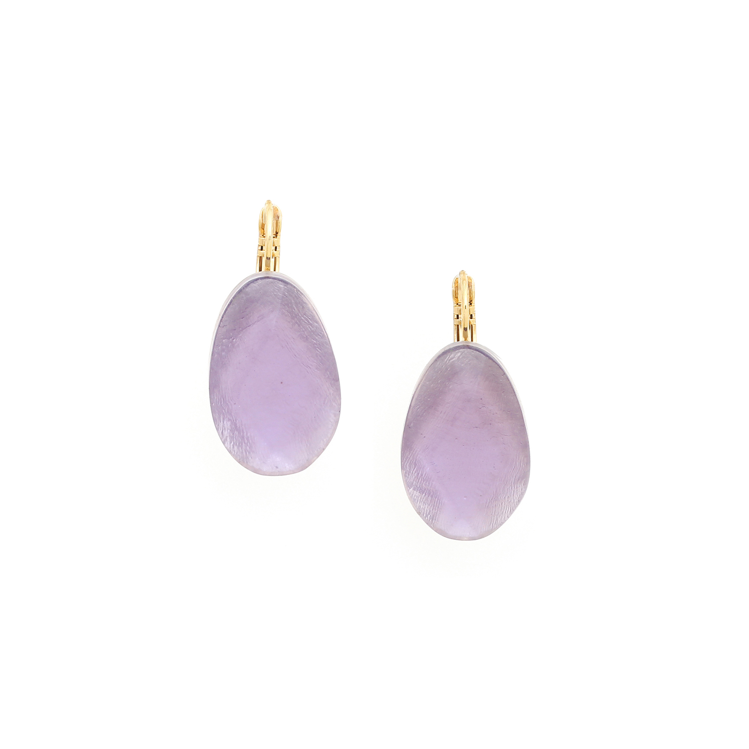 ფრანგული ბრენდი Nature Bijoux ს ხელნაკეთი საყურე, კოლექციიდან LAVENDER. სამკაულის ბაზად გამოყენებულია თითბერი, კოლექციაში გამოყენებული ნატურალური მასალები და ქვები: დამუშავებული მინა, ბამბის ძაფი, მარგალიტი, ნაცრისფერი აბაზონის ხე, ლაბრადორიტი, თითბერი.