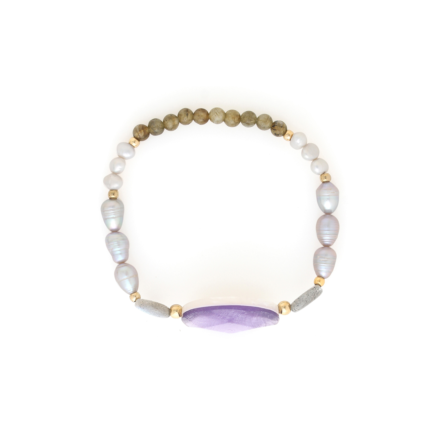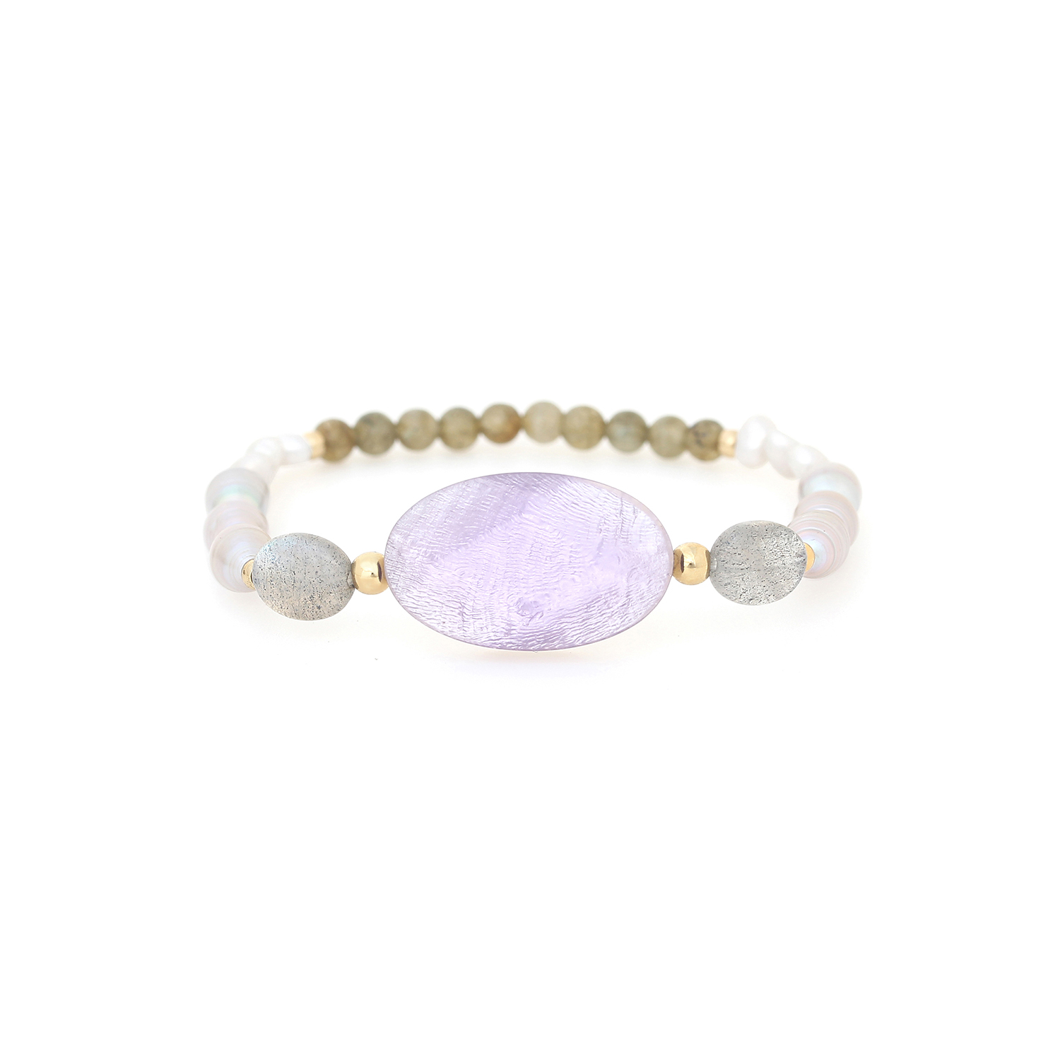 ფრანგული ბრენდი Nature Bijoux ს ხელნაკეთი სამაჯური, კოლექციიდან LAVENDER. სამკაულის ბაზად გამოყენებულია თითბერი, კოლექციაში გამოყენებული ნატურალური მასალები და ქვები: დამუშავებული მინა, ბამბის ძაფი, მარგალიტი, ნაცრისფერი აბაზონის ხე, ლაბრადორიტი, თითბერი.