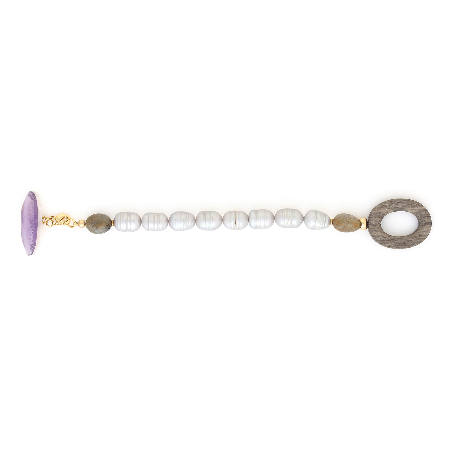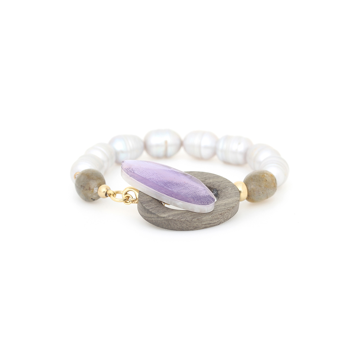 ფრანგული ბრენდი Nature Bijoux ს ხელნაკეთი სამაჯური, კოლექციიდან LAVENDER. სამკაულის ბაზად გამოყენებულია თითბერი, კოლექციაში გამოყენებული ნატურალური მასალები და ქვები: დამუშავებული მინა, ბამბის ძაფი, მარგალიტი, ნაცრისფერი აბაზონის ხე, ლაბრადორიტი, თითბერი.