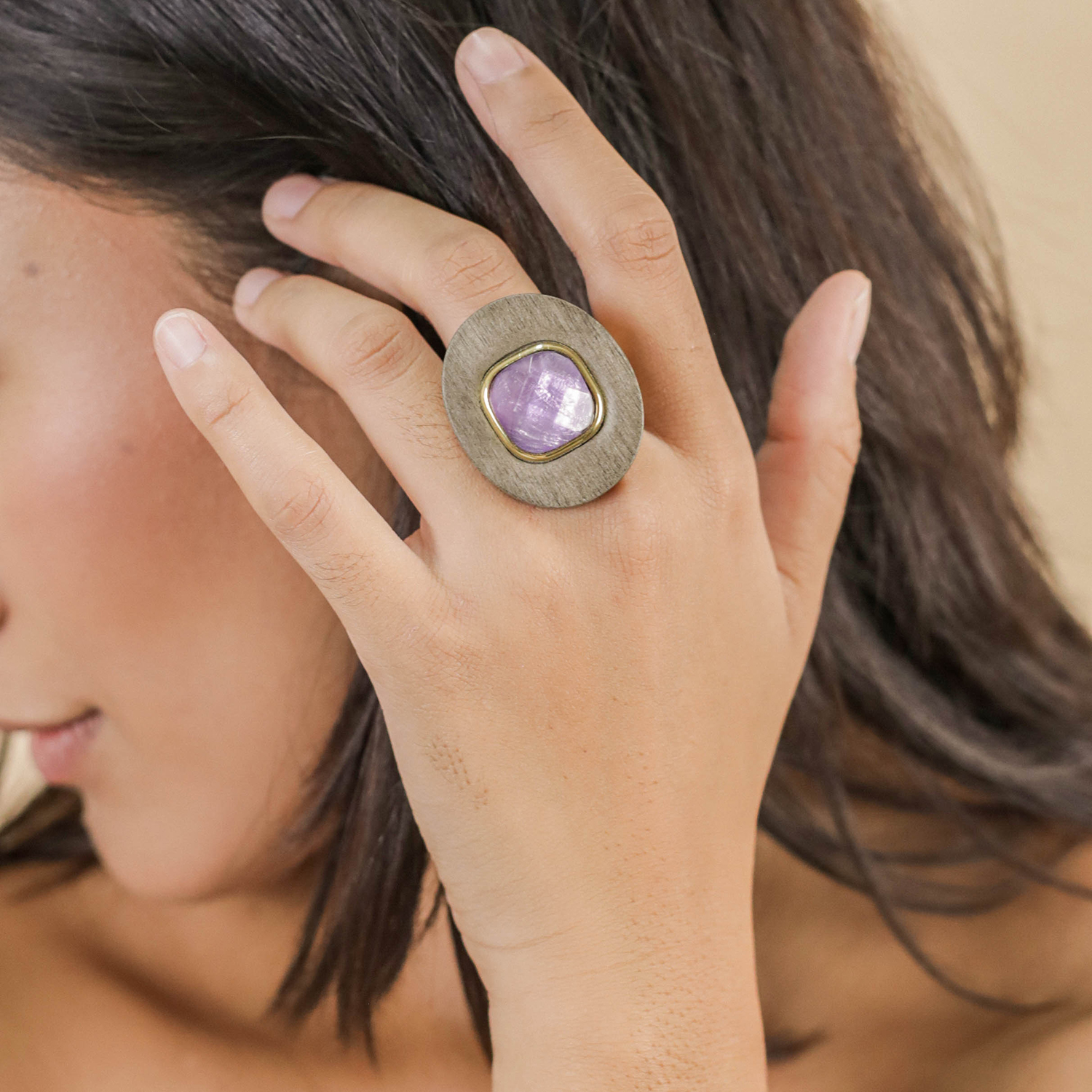 ფრანგული ბრენდი Nature Bijoux ს ხელნაკეთი ბეჭედი, კოლექციიდან LAVENDER. სამკაულის ბაზად გამოყენებულია თითბერი, კოლექციაში გამოყენებული ნატურალური მასალები და ქვები: დამუშავებული მინა, ბამბის ძაფი, მარგალიტი, ნაცრისფერი აბაზონის ხე, ლაბრადორიტი, თითბერი.