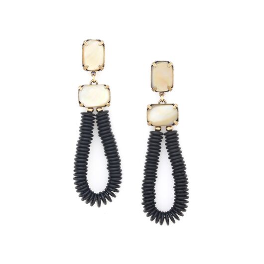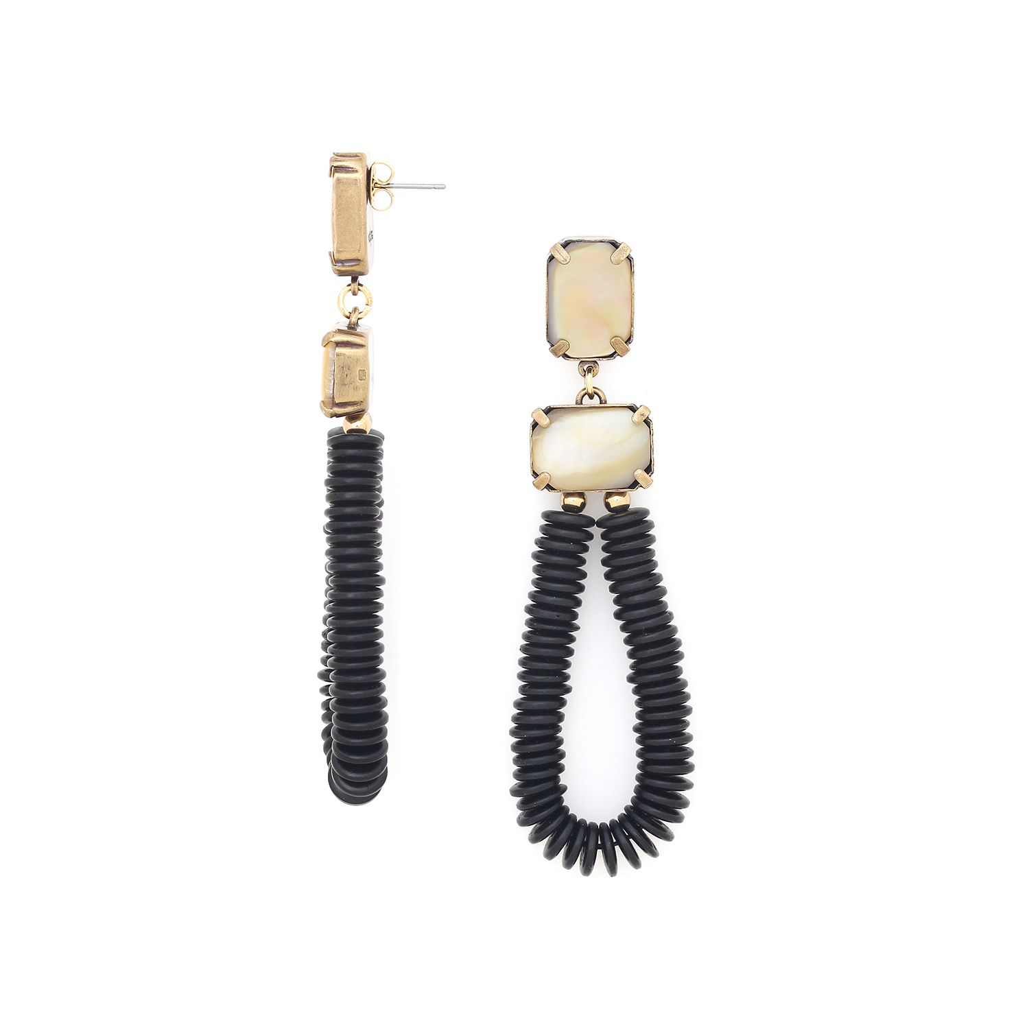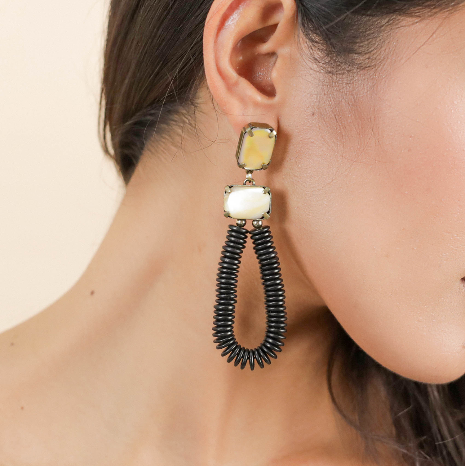 ფრანგული ბრენდი Nature Bijoux ს ხელნაკეთი საყურე, კოლექციიდან SALAMANDRA. სამკაულის ბაზად გამოყენებულია თითბერი, კოლექციაში გამოყენებული ნატურალური მასალები და ქვები: ქოქოსის ხე, რქა, ოქროსფერი სადაფი.