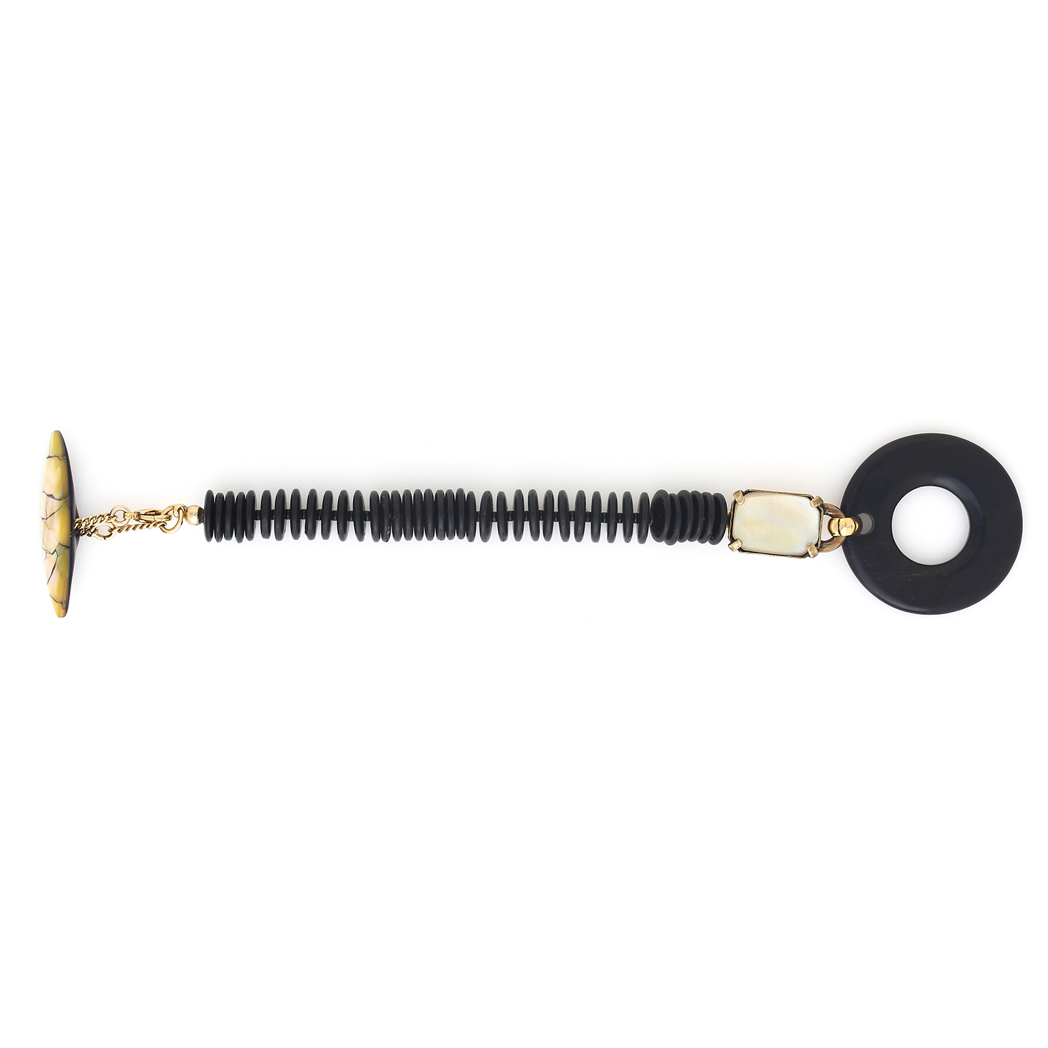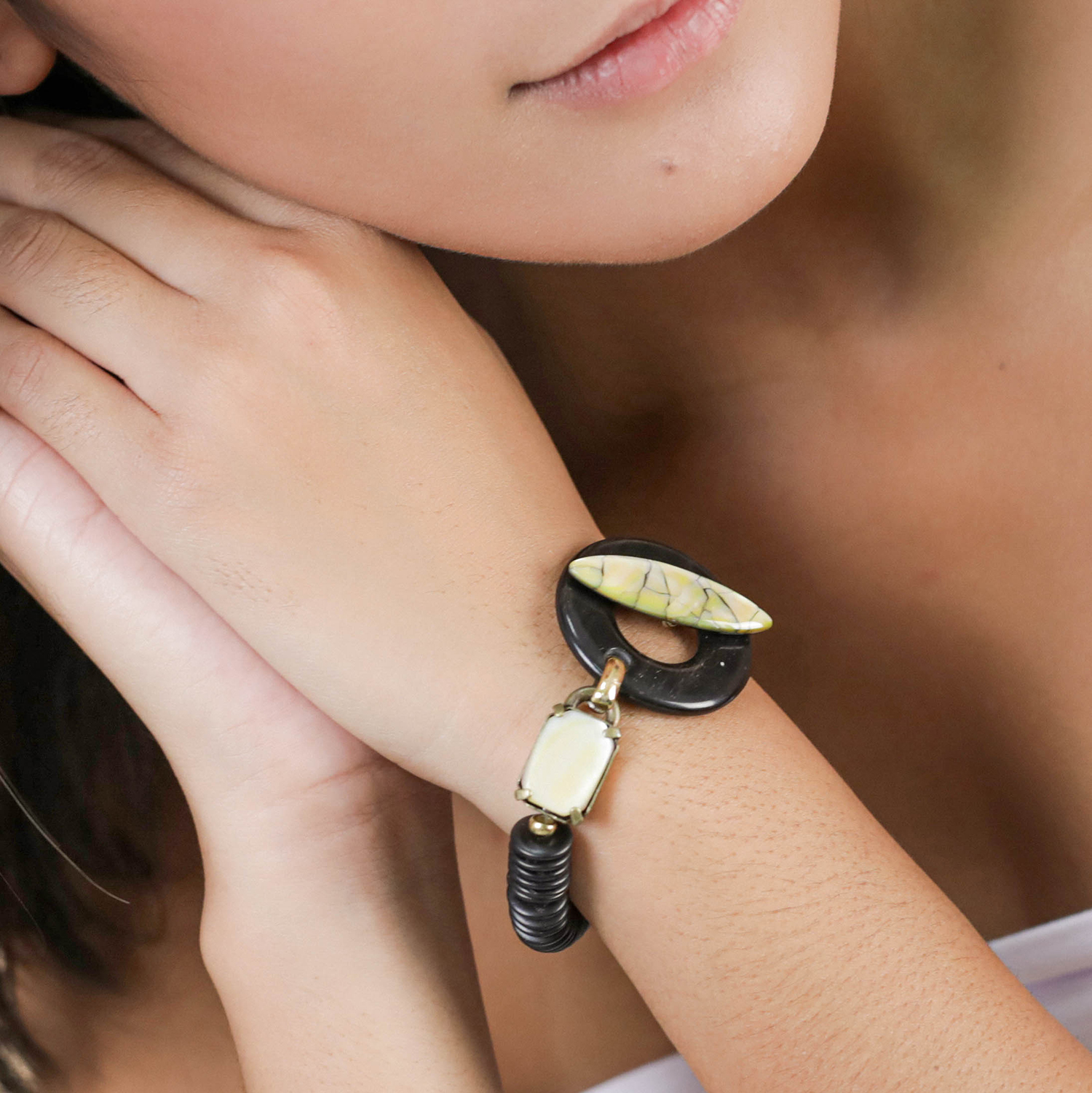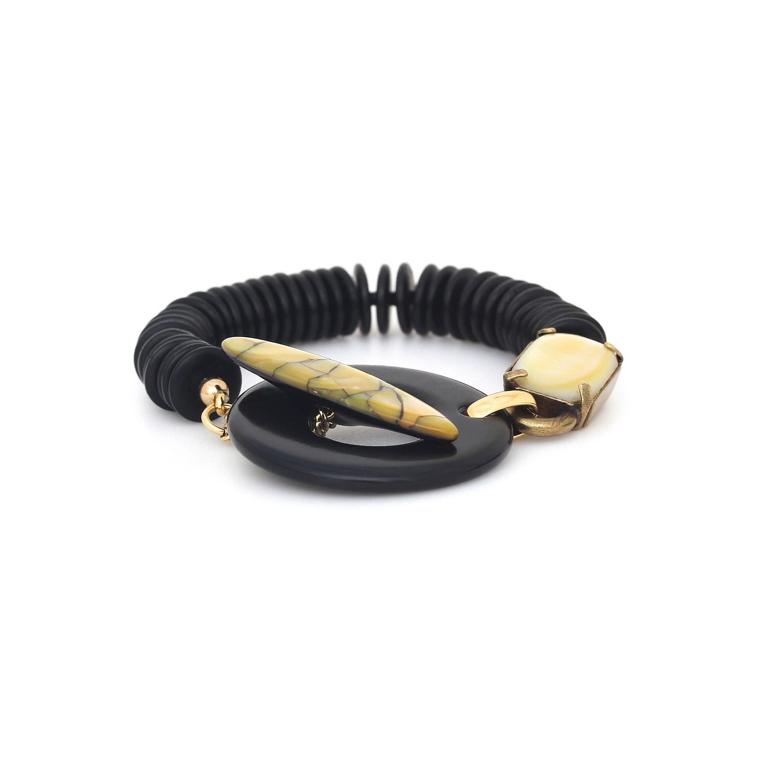 ფრანგული ბრენდი Nature Bijoux ს ხელნაკეთი სამაჯური, კოლექციიდან SALAMANDRA. სამკაულის ბაზად გამოყენებულია თითბერი, კოლექციაში გამოყენებული ნატურალური მასალები და ქვები: ქოქოსის ხე, რქა, ოქროსფერი სადაფი.