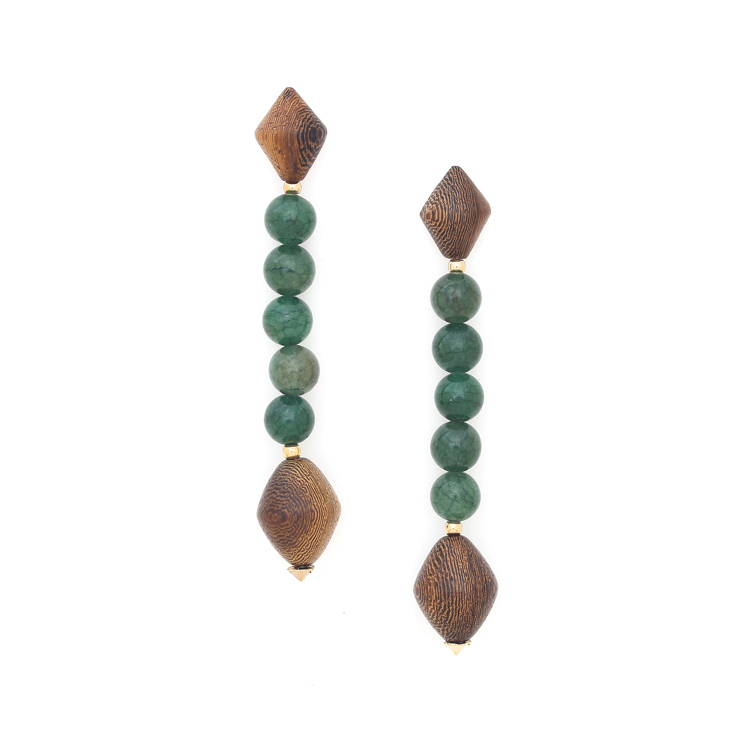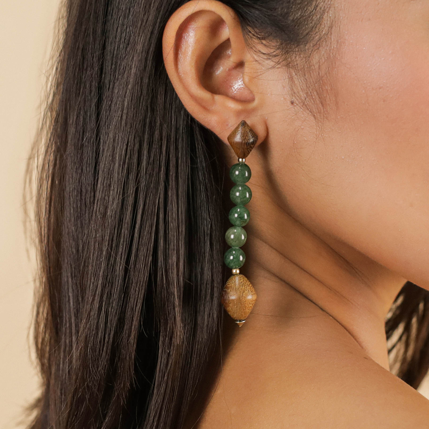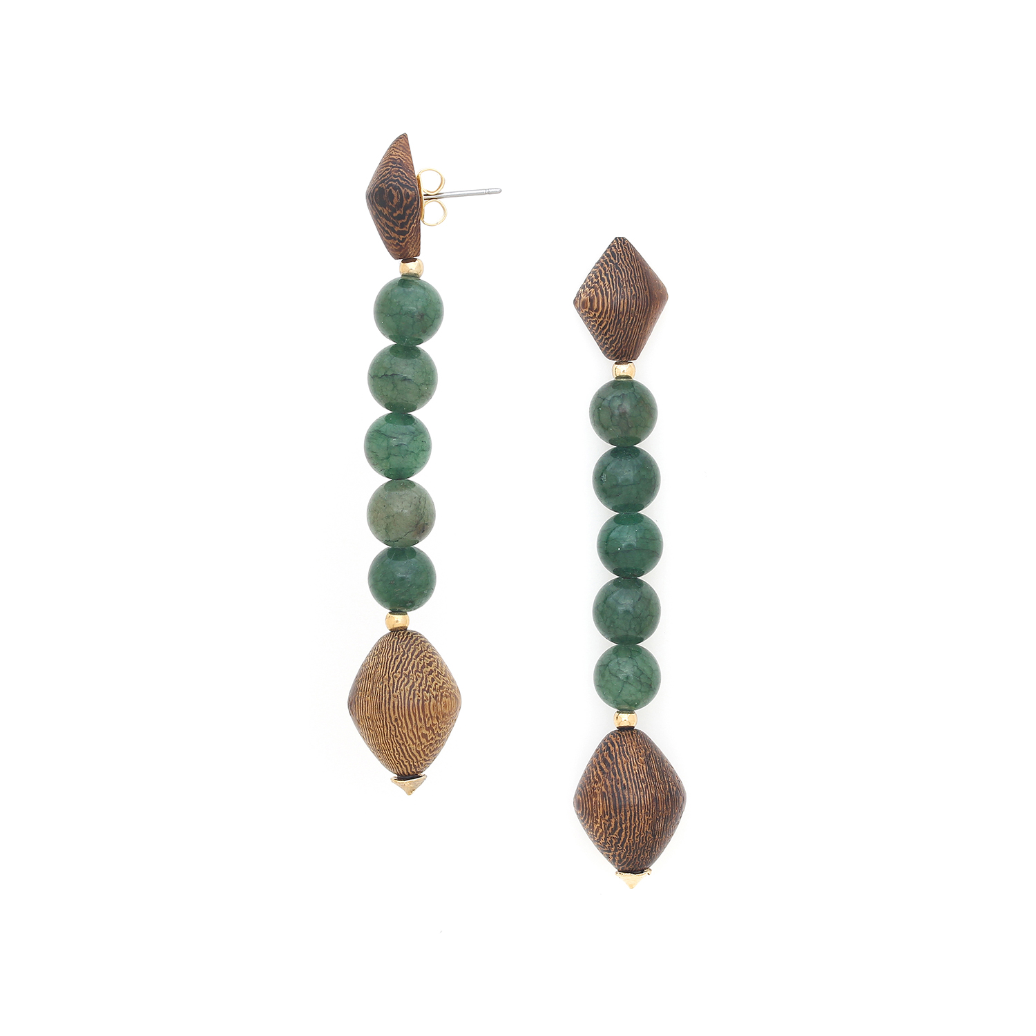 ფრანგული ბრენდი Nature Bijoux ს ხელნაკეთი საყურე, კოლექციიდან AVENTURINE. სამკაულის ბაზად გამოყენებულია თითბერი, კოლექციაში გამოყენებული ნატურალური მასალები და ქვები: კალიფორნიული თეთრი მუხა, მწვანე ავანტიურინი.
