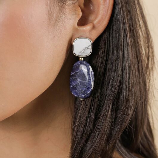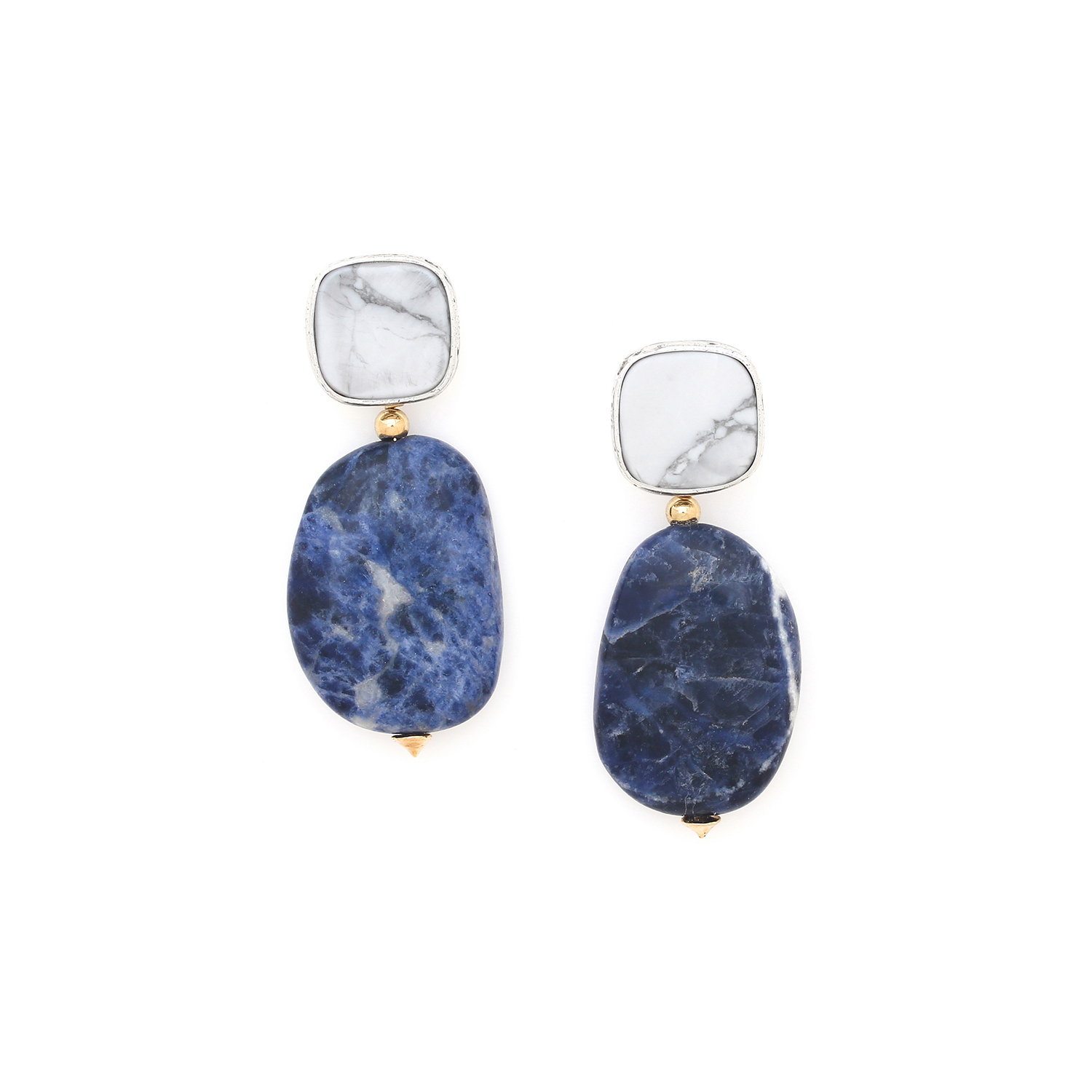 ფრანგული ბრენდი Nature Bijoux ს ხელნაკეთი საყურე, კოლექციიდან ARCTIQUE. სამკაულის ბაზად გამოყენებულია თითბერი, კოლექციაში გამოყენებული ნატურალური მასალები და ქვები: აქვამარინი, ჰაულიტი, სოდალიტი, თითბერი, კალის შენადნობი.