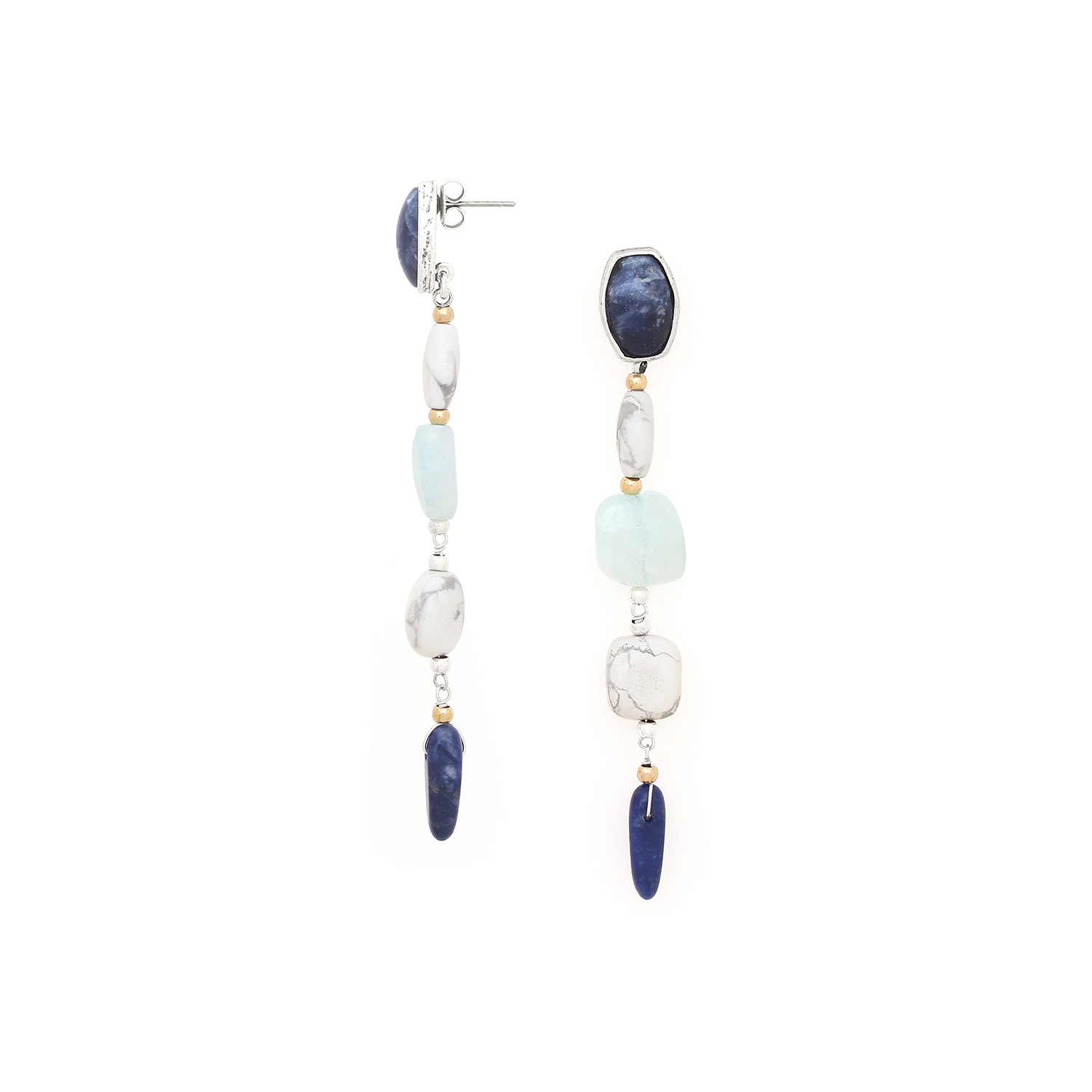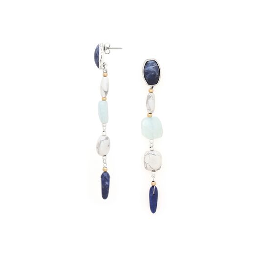 ფრანგული ბრენდი Nature Bijoux ს ხელნაკეთი საყურე, კოლექციიდან ARCTIQUE. სამკაულის ბაზად გამოყენებულია თითბერი, კოლექციაში გამოყენებული ნატურალური მასალები და ქვები: აქვამარინი, ჰაულიტი, სოდალიტი, თითბერი, კალის შენადნობი.