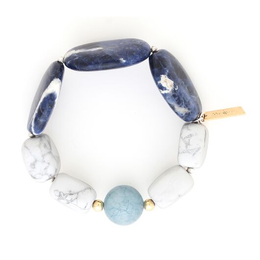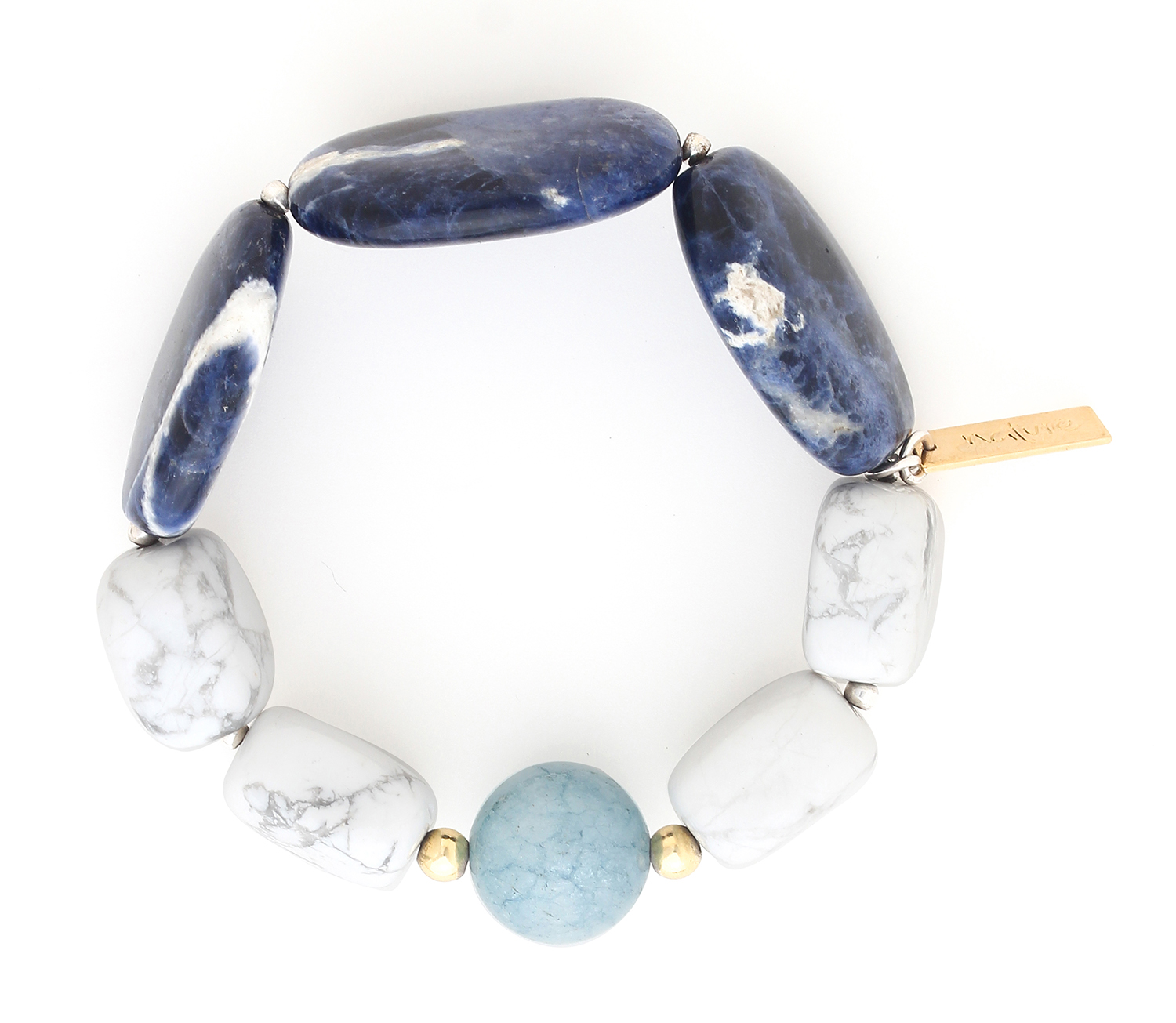 ფრანგული ბრენდი Nature Bijoux ს ხელნაკეთი სამაჯური, კოლექციიდან ARCTIQUE. სამკაულის ბაზად გამოყენებულია თითბერი, კოლექციაში გამოყენებული ნატურალური მასალები და ქვები: აქვამარინი, ჰაულიტი, სოდალიტი, თითბერი, კალის შენადნობი.