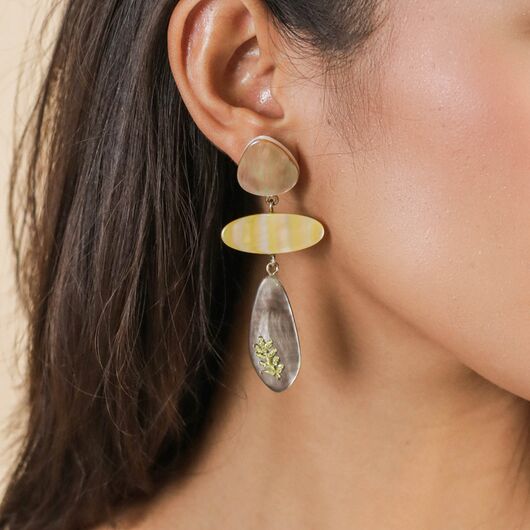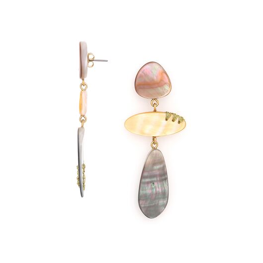ფრანგული ბრენდი Nature Bijoux ს ხელნაკეთი საყურე, კოლექციიდან CALLIOPE. სამკაულის ბაზად გამოყენებულია თითბერი, კოლექციაში გამოყენებული ნატურალური მასალები და ქვები: ფალავნის მარგალიტი, ყავისფერი მარგალიტი, ოქროს ძაფი, ოქროსფერი მარგალიტი, თეთრი მარგალიტი, თითბერი.