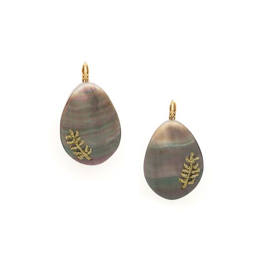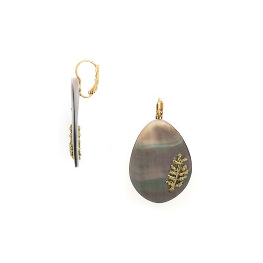 ფრანგული ბრენდი Nature Bijoux ს ხელნაკეთი საყურე, კოლექციიდან CALLIOPE. სამკაულის ბაზად გამოყენებულია თითბერი, კოლექციაში გამოყენებული ნატურალური მასალები და ქვები: ფალავნის მარგალიტი, ყავისფერი მარგალიტი, ოქროს ძაფი, ოქროსფერი მარგალიტი, თეთრი მარგალიტი, თითბერი.