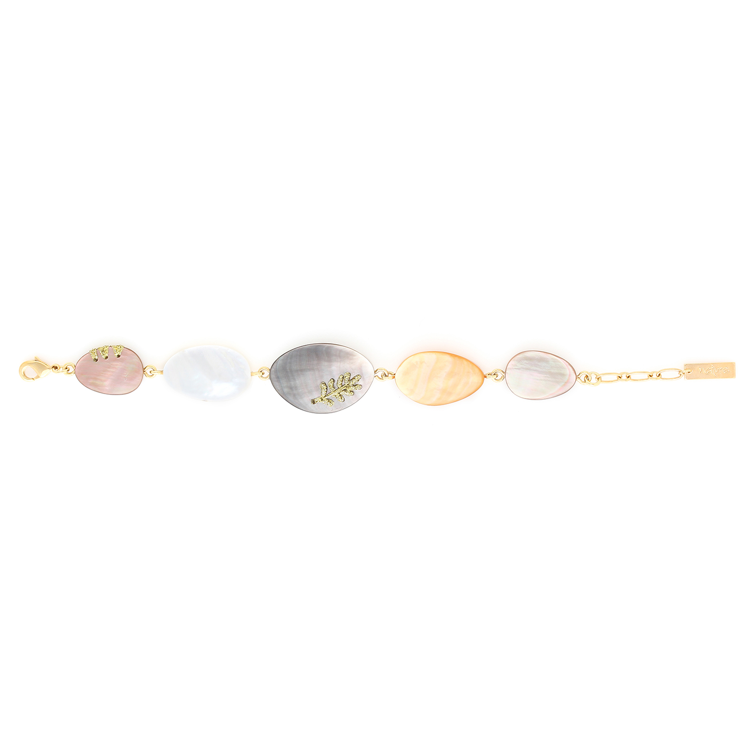 ფრანგული ბრენდი Nature Bijoux ს ხელნაკეთი სამაჯური, კოლექციიდან CALLIOPE. სამკაულის ბაზად გამოყენებულია თითბერი, კოლექციაში გამოყენებული ნატურალური მასალები და ქვები: ფალავნის მარგალიტი, ყავისფერი მარგალიტი, ოქროს ძაფი, ოქროსფერი მარგალიტი, თეთრი მარგალიტი, თითბერი.
