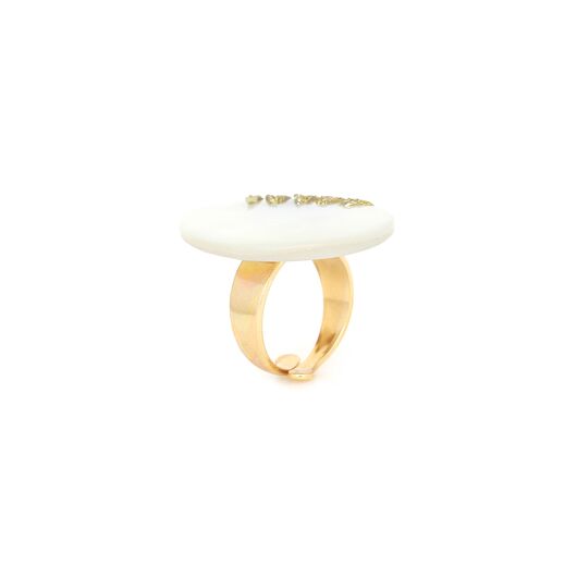 ფრანგული ბრენდი Nature Bijoux ს ხელნაკეთი ბეჭედი, კოლექციიდან CALLIOPE. სამკაულის ბაზად გამოყენებულია თითბერი, კოლექციაში გამოყენებული ნატურალური მასალები და ქვები: ფალავნის მარგალიტი, ყავისფერი მარგალიტი, ოქროს ძაფი, ოქროსფერი მარგალიტი, თეთრი მარგალიტი, თითბერი.