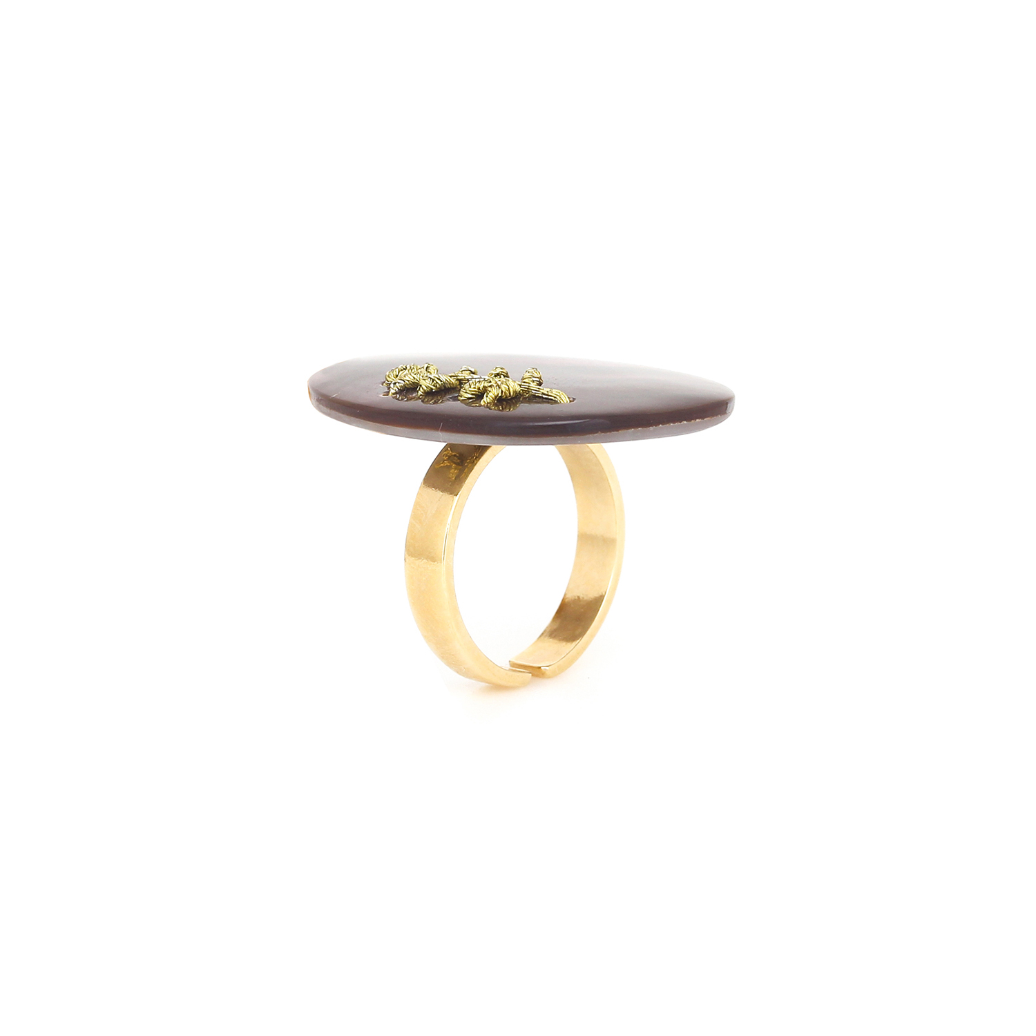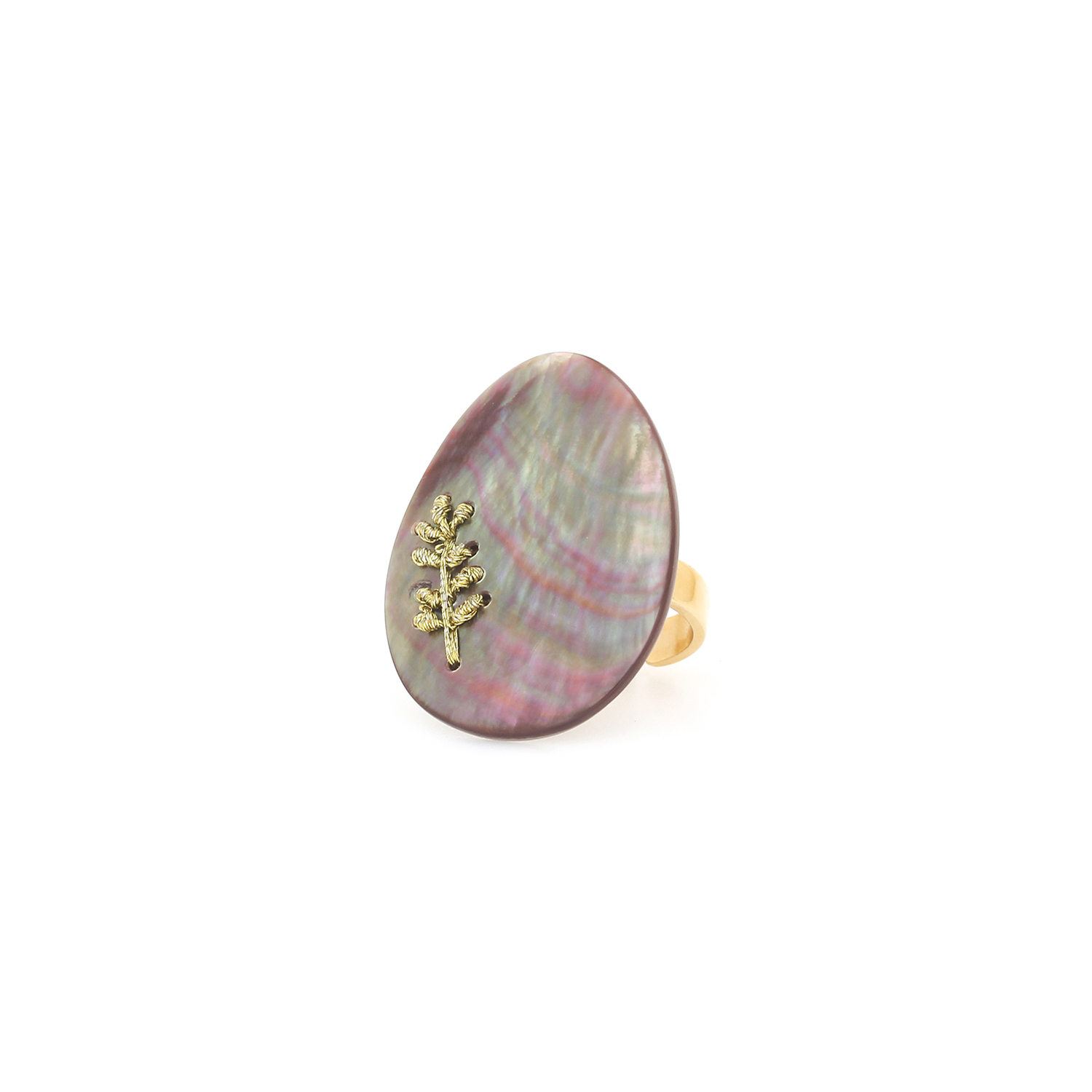 ფრანგული ბრენდი Nature Bijoux ს ხელნაკეთი ბეჭედი, კოლექციიდან CALLIOPE. სამკაულის ბაზად გამოყენებულია თითბერი, კოლექციაში გამოყენებული ნატურალური მასალები და ქვები: ფალავნის მარგალიტი, ყავისფერი მარგალიტი, ოქროს ძაფი, ოქროსფერი მარგალიტი, თეთრი მარგალიტი, თითბერი.