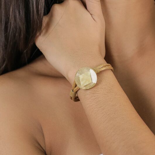 ფრანგული ბრენდი Nature Bijoux ს ხელნაკეთი სამაჯური, კოლექციიდან GOLDEN HOUR. სამკაულის ბაზად გამოყენებულია თითბერი, კოლექციაში გამოყენებული ნატურალური მასალები და ქვები: დამუშავებული ბამბის ძაფი, ტყავი, ქვიშა, ოქროსფერი მარგალიტი, თითბერი, კალის შენადნობი.