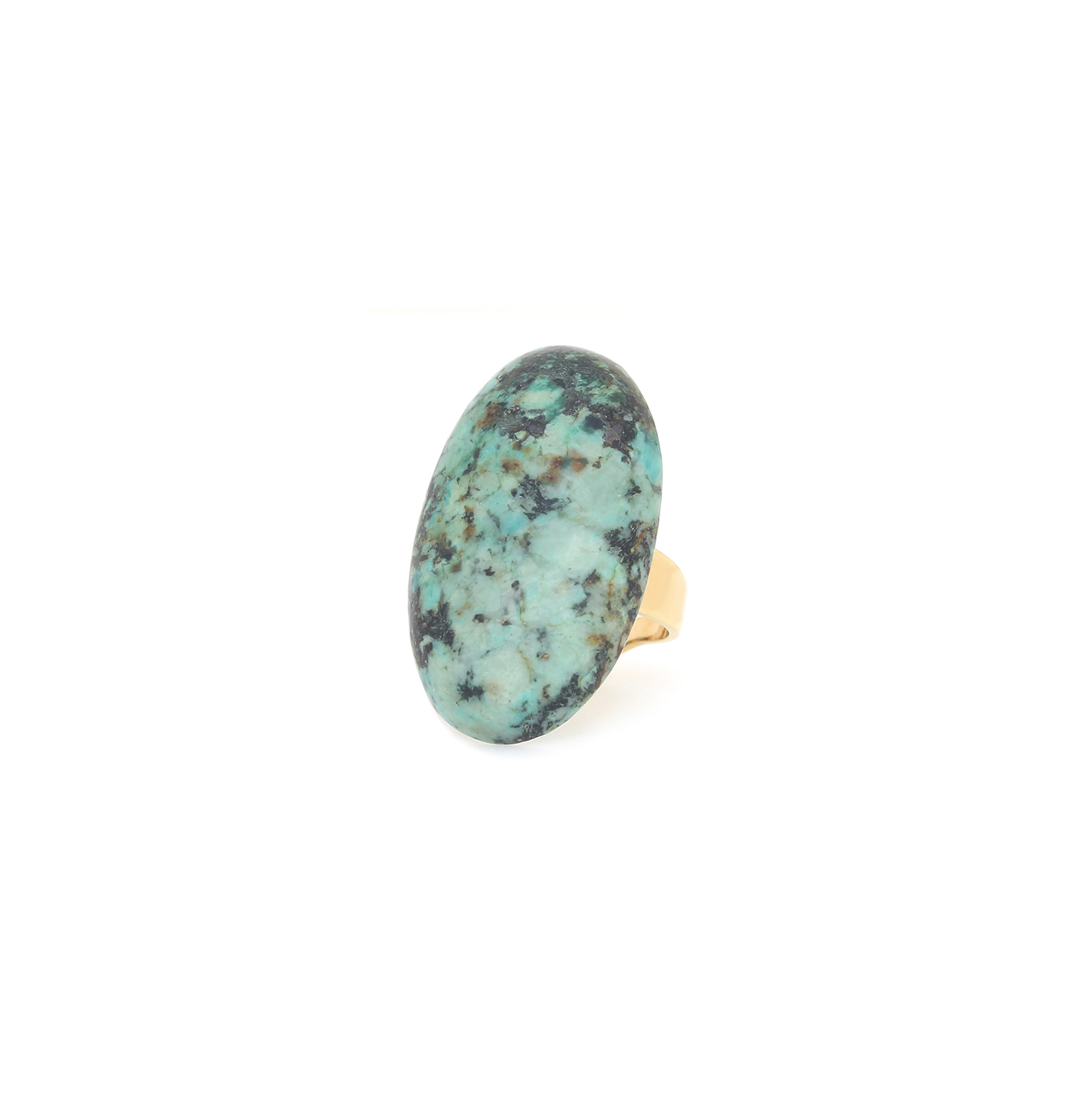 ფრანგული ბრენდი Nature Bijoux ს ხელნაკეთი ბეჭედი, კოლექციიდან KHALANGA. სამკაულის ბაზად გამოყენებულია თითბერი, კოლექციაში გამოყენებული ნატურალური მასალები და ქვები: მოლუსკის ნიჟარა, დამუშავებული ბამბის ძაფი, ფისი, აფრიკული ფირუზი, თითბერი, კალის სენადნობი.