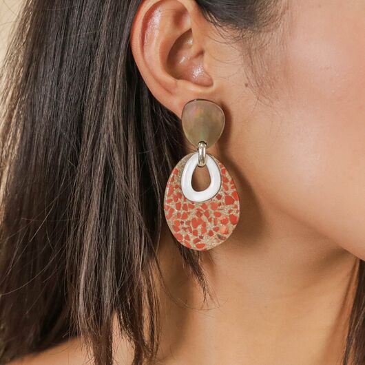 ფრანგული ბრენდი Nature Bijoux ს ხელნაკეთი საყურე, კოლექციიდან MILANO. სამკაულის ბაზად გამოყენებულია თითბერი, კოლექციაში გამოყენებული ნატურალური მასალები და ქვები: ყავისფერი მარგალიტი, დამუშავებული ბამბის ძაფი,წითელი იასპი, ვარდიფერი ნიჟარა, ქვიშა, თითბერი, კალის შენადნობი.