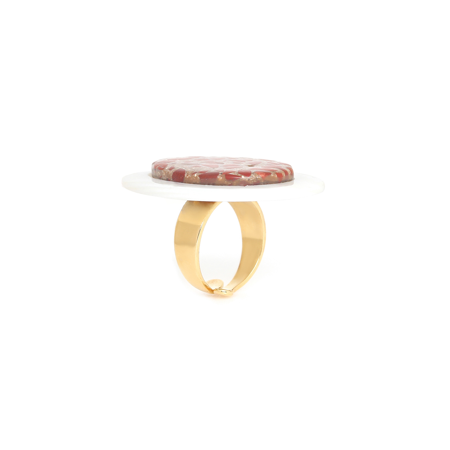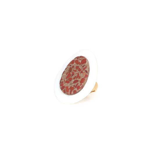 ფრანგული ბრენდი Nature Bijoux ს ხელნაკეთი ბეჭედი, კოლექციიდან MILANO. სამკაულის ბაზად გამოყენებულია თითბერი, კოლექციაში გამოყენებული ნატურალური მასალები და ქვები: ყავისფერი მარგალიტი, დამუშავებული ბამბის ძაფი,წითელი იასპი, ვარდიფერი ნიჟარა, ქვიშა, თითბერი, კალის შენადნობი.