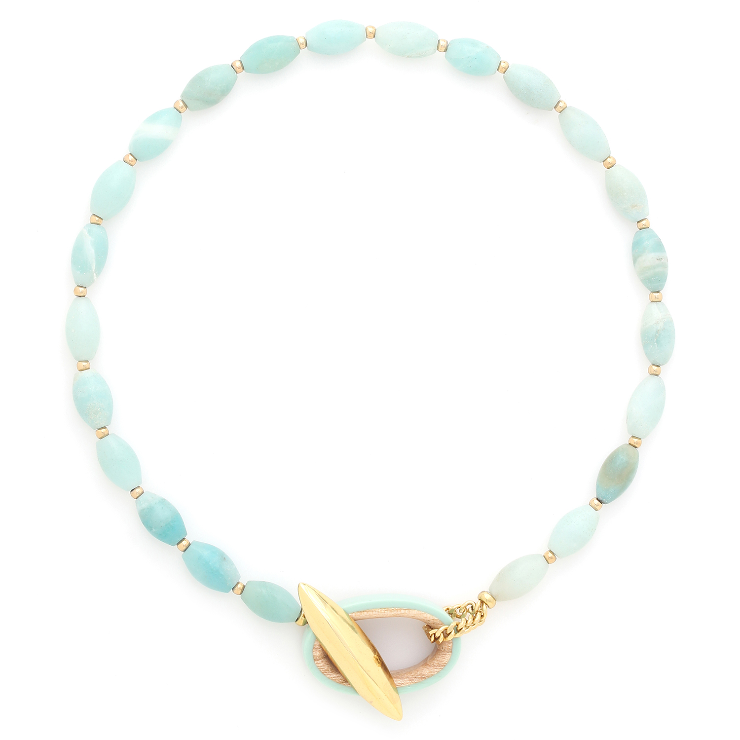 ფრანგული ბრენდი Nature Bijoux ს ხელნაკეთი ყელსაბამი, კოლექციიდან MISSISSIPPI. სამკაულის ბაზად გამოყენებულია თითბერი, კოლექციაში გამოყენებული ნატურალური მასალები და ქვები: ამაზონიტი, დამუშავებული ბამბის ძაფი, ნაცრის ხე (ზეთისხილისა და იასამნისებრთა ოჯახი), თითბერი, კალის შენადნობი.