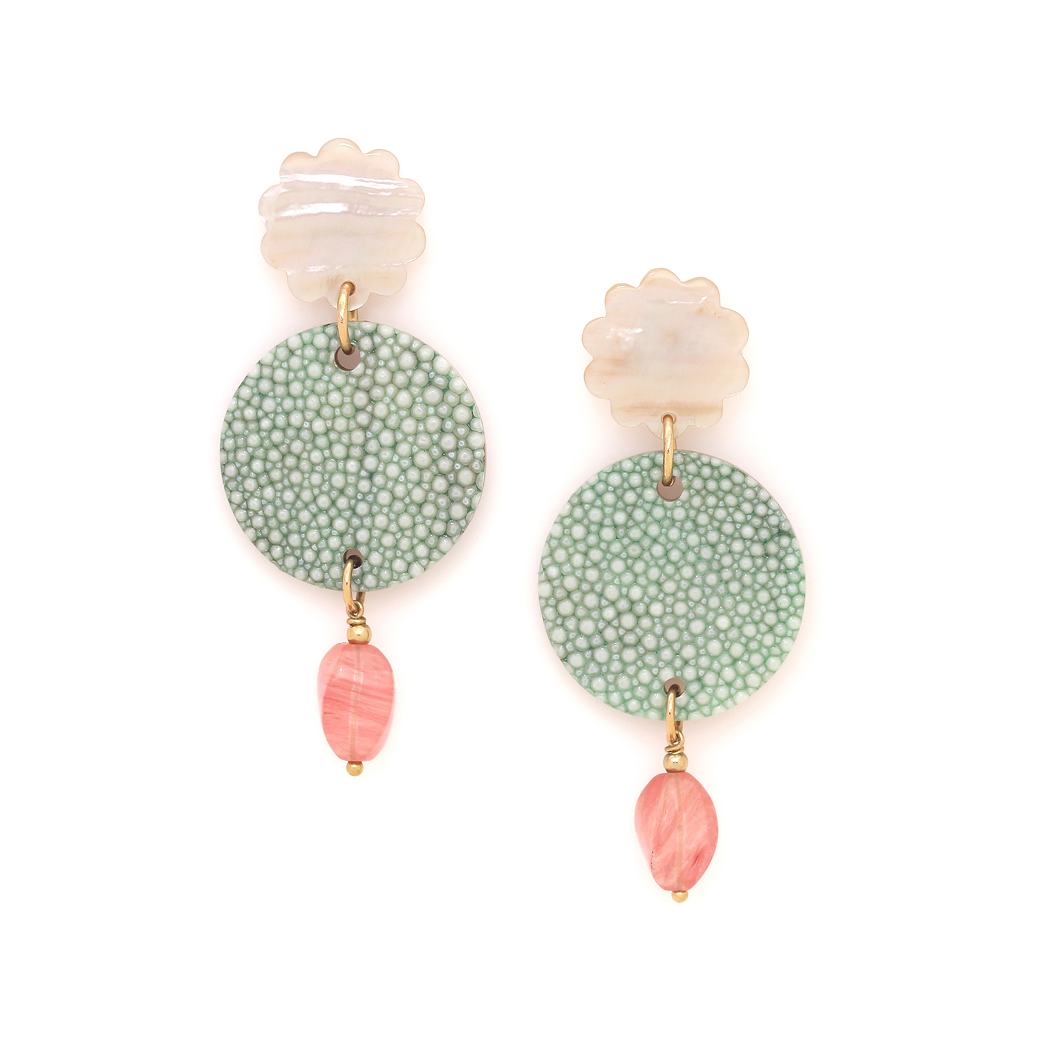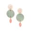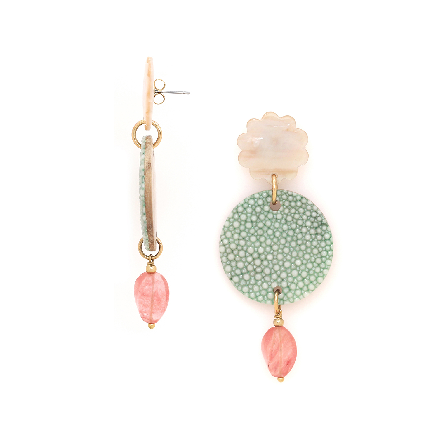 ფრანგული ბრენდი Nature Bijoux ს ხელნაკეთი საყურე, კოლექციიდან PIVOINE. სამკაულის ბაზად გამოყენებულია თითბერი, კოლექციაში გამოყენებული ნატურალური მასალები და ქვები: ვარდისფერი კვარცი, ნიჟარა, თევზის ტყავი, გემელინა(ხე), თითბერი.