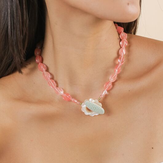 ფრანგული ბრენდი Nature Bijoux ს ხელნაკეთი ყელსაბამი, კოლექციიდან PIVOINE. სამკაულის ბაზად გამოყენებულია თითბერი, კოლექციაში გამოყენებული ნატურალური მასალები და ქვები: ვარდისფერი კვარცი, ნიჟარა, თევზის ტყავი, გემელინა(ხე), თითბერი.