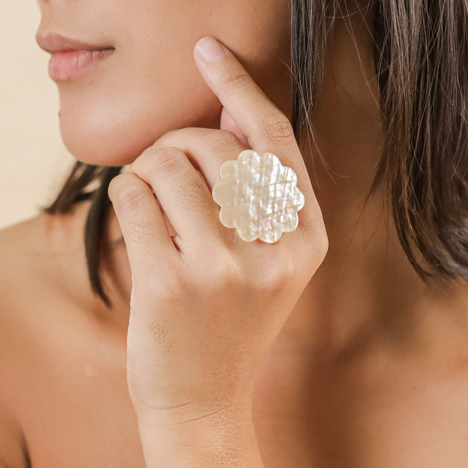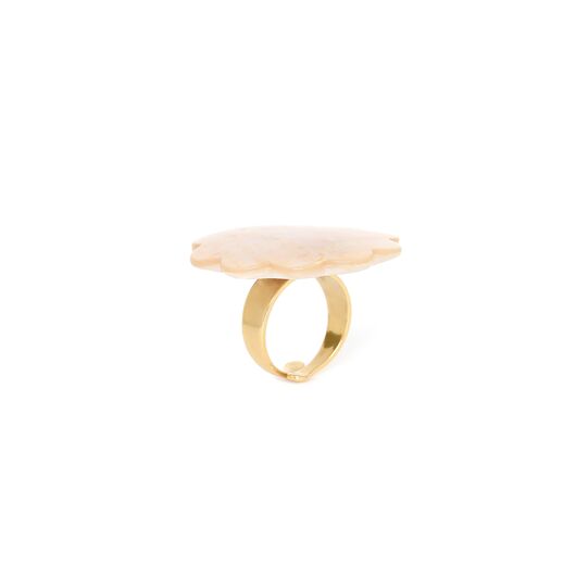 ფრანგული ბრენდი Nature Bijoux ს ხელნაკეთი ბეჭედი, კოლექციიდან PIVOINE. სამკაულის ბაზად გამოყენებულია თითბერი, კოლექციაში გამოყენებული ნატურალური მასალები და ქვები: ვარდისფერი კვარცი, ნიჟარა, თევზის ტყავი, გემელინა(ხე), თითბერი.