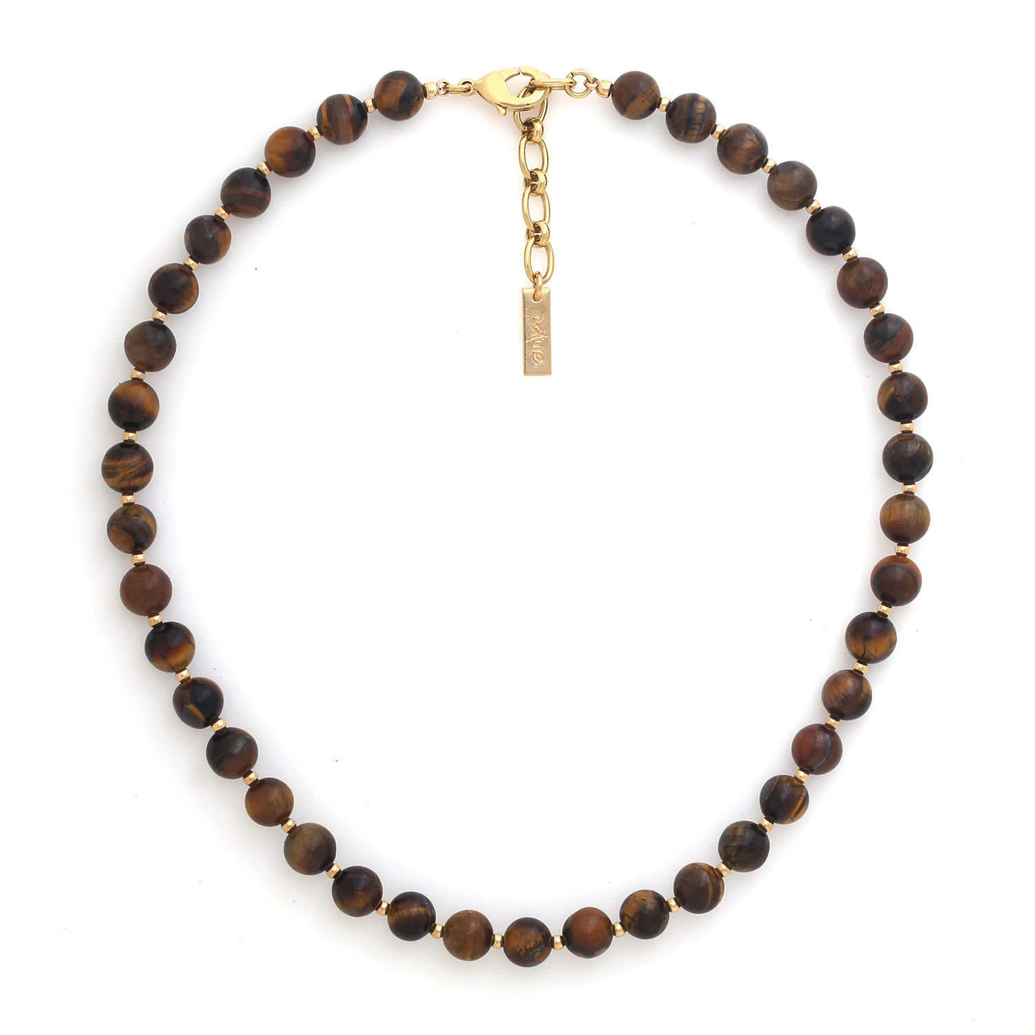 ფრანგული ბრენდი Nature Bijoux ს ხელნაკეთი ყელსაბამი, კოლექციიდან JAGUAR. სამკაულის ბაზად გამოყენებულია თითბერი, კოლექციაში გამოყენებული ნატურალური მასალები და ქვები: ყავისფერი სადაფი, რქა ,თითბერი, ვეფხვის თვალი.