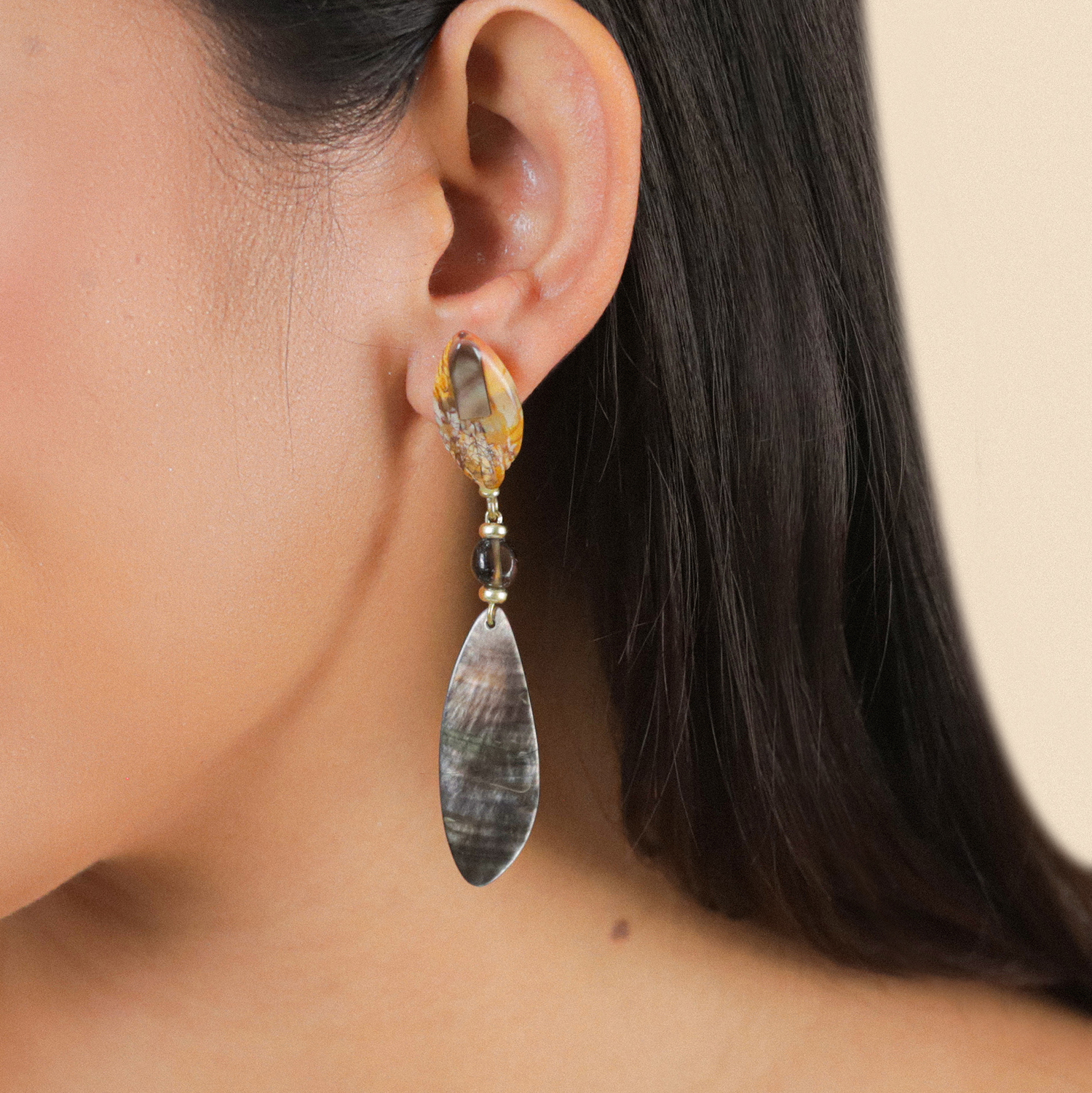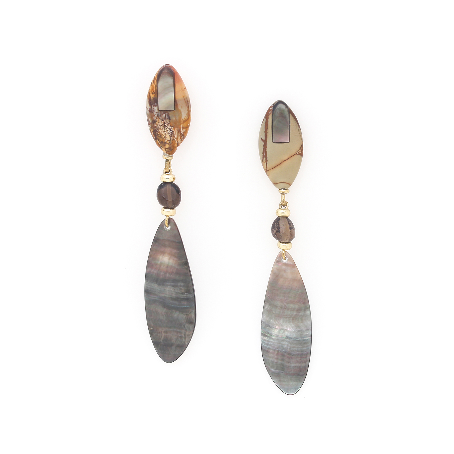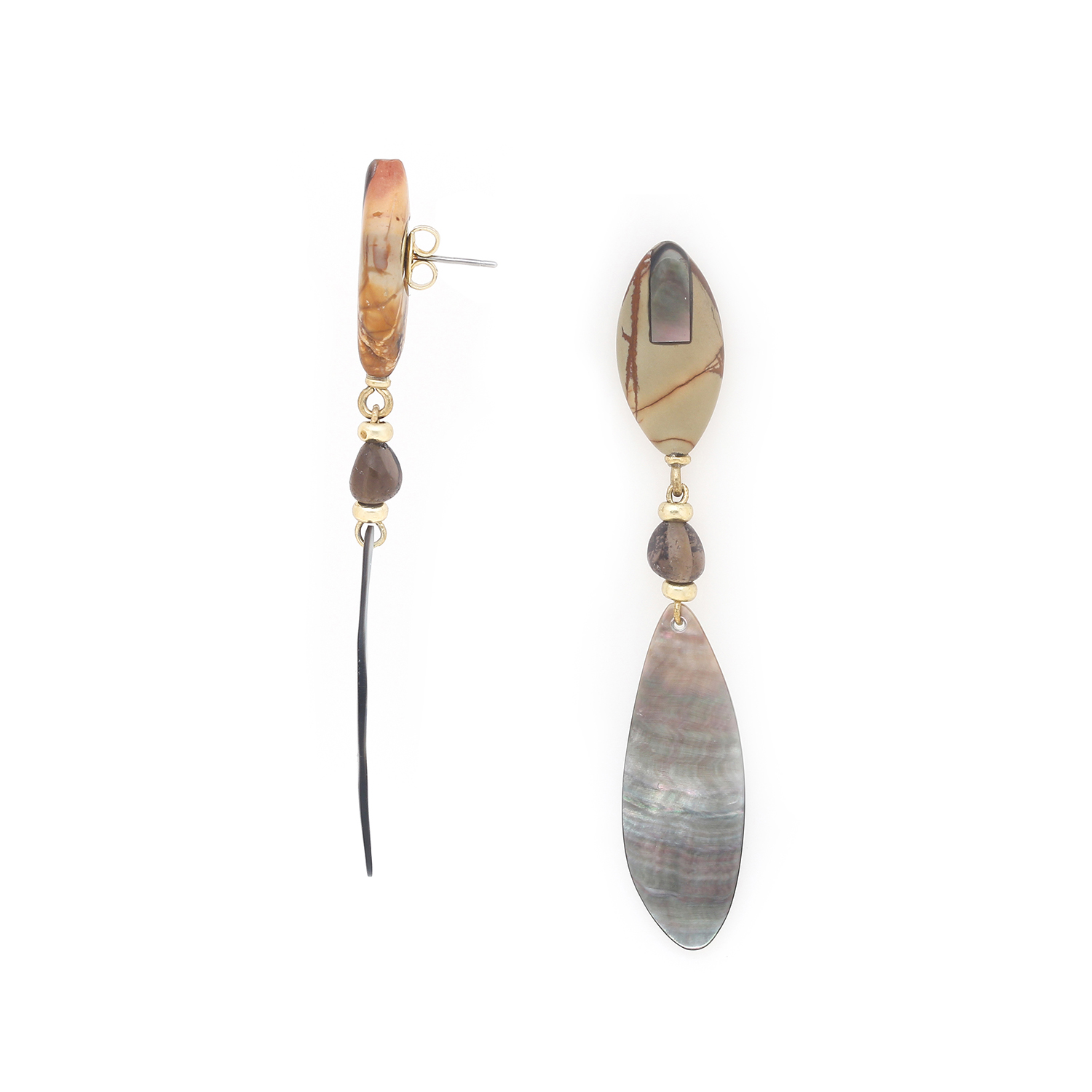 ფრანგული ბრენდი Nature Bijoux ს ხელნაკეთი საყურე, კოლექციიდან L'ILE ROUSSE. სამკაულის ბაზად გამოყენებულია თითბერი, კოლექციაში გამოყენებული ნატურალური მასალები და ქვები: ფალავნის მარგალიტი, მარგალიტი, იასპი, კვამლისფერი კვარცი, თითბერი.
