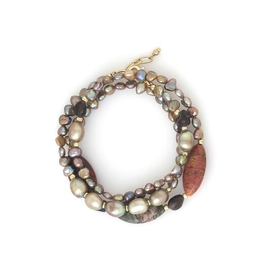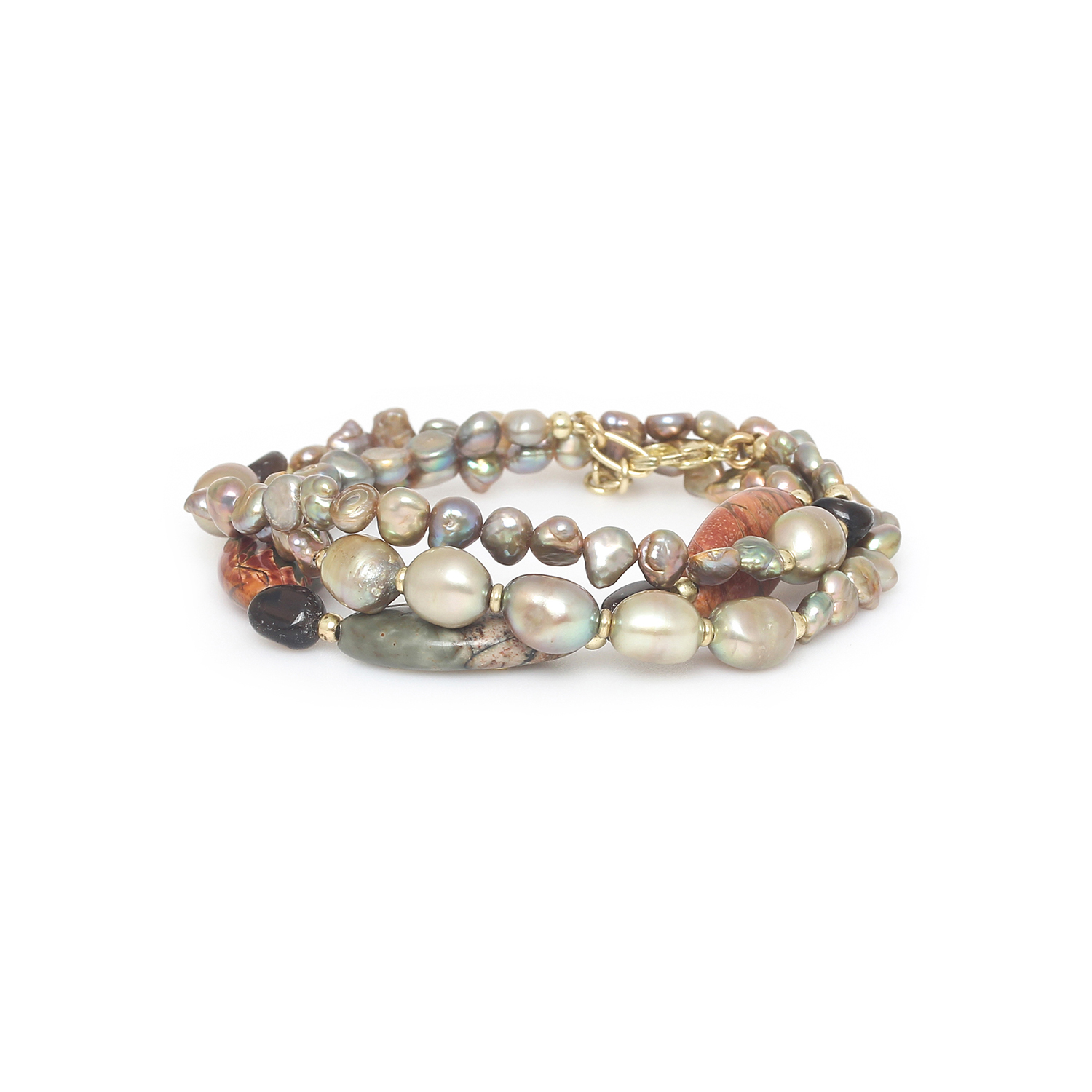 ფრანგული ბრენდი Nature Bijoux ს ხელნაკეთი სამაჯური, კოლექციიდან L'ILE ROUSSE. სამკაულის ბაზად გამოყენებულია თითბერი, კოლექციაში გამოყენებული ნატურალური მასალები და ქვები: ფალავნის მარგალიტი, მარგალიტი, იასპი, კვამლისფერი კვარცი, თითბერი.