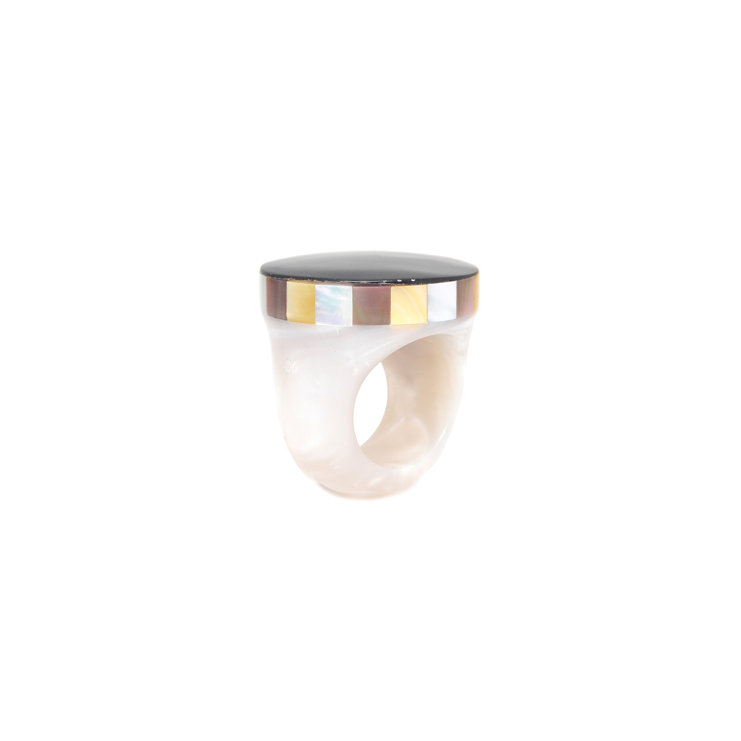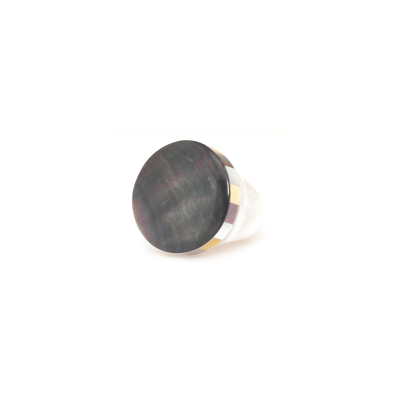 ფრანგული ბრენდი Nature Bijoux ს ხელნაკეთი ბეჭედი, კოლექციიდან SAN LAZZARO. სამკაულის ბაზად გამოყენებულია თითბერი, კოლექციაში გამოყენებული ნატურალური მასალები და ქვები: ფალავნის მარგალიტი, ყავისფერი სადაფი, თეთრი სადაფი, ოქროსფერი სადაფი, თითბერი.