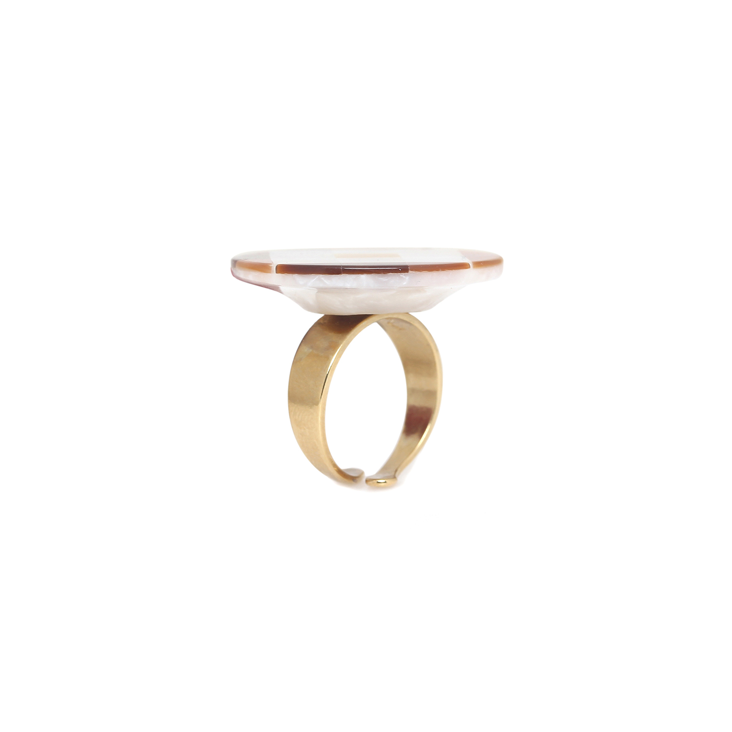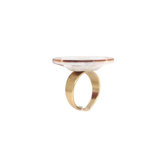 ფრანგული ბრენდი Nature Bijoux ს ხელნაკეთი ბეჭედი, კოლექციიდან SAN LAZZARO. სამკაულის ბაზად გამოყენებულია თითბერი, კოლექციაში გამოყენებული ნატურალური მასალები და ქვები: ფალავნის მარგალიტი, ყავისფერი სადაფი, თეთრი სადაფი, ოქროსფერი სადაფი, თითბერი.