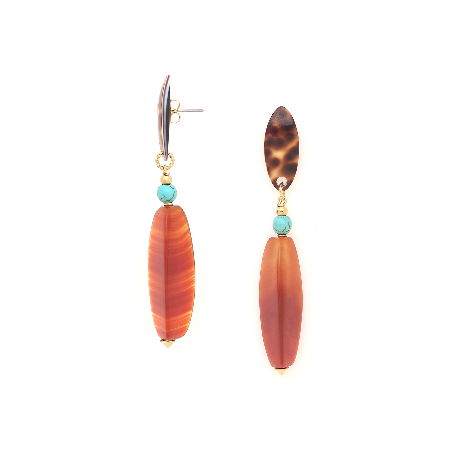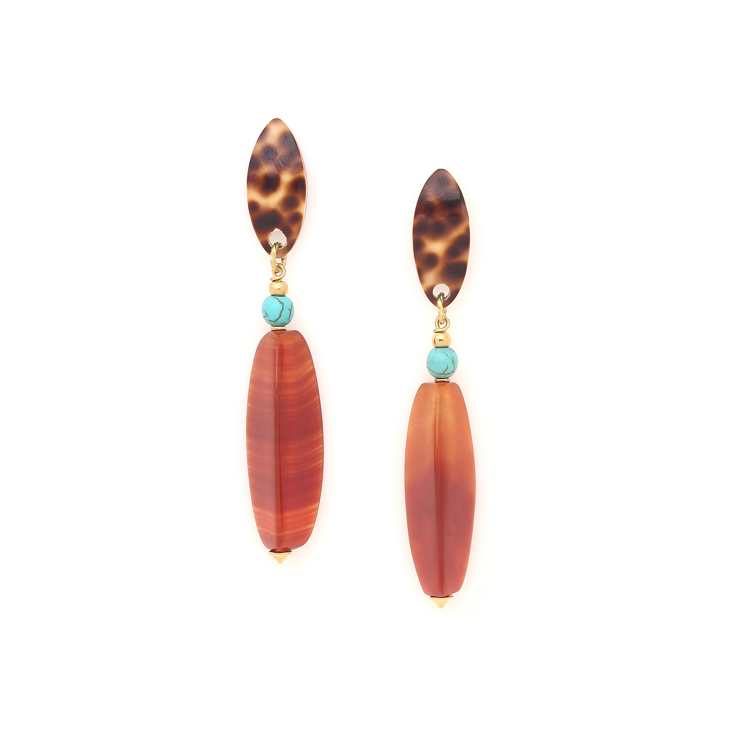 ფრანგული ბრენდი Nature Bijoux ს ხელნაკეთი საყურე, კოლექციიდან SURABAYA. სამკაულის ბაზად გამოყენებულია თითბერი, კოლექციაში გამოყენებული ნატურალური მასალები და ქვები: წითელი აგატი, ჰუალიტი, ზღვის ლოკოკინა, თითბერი.