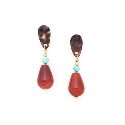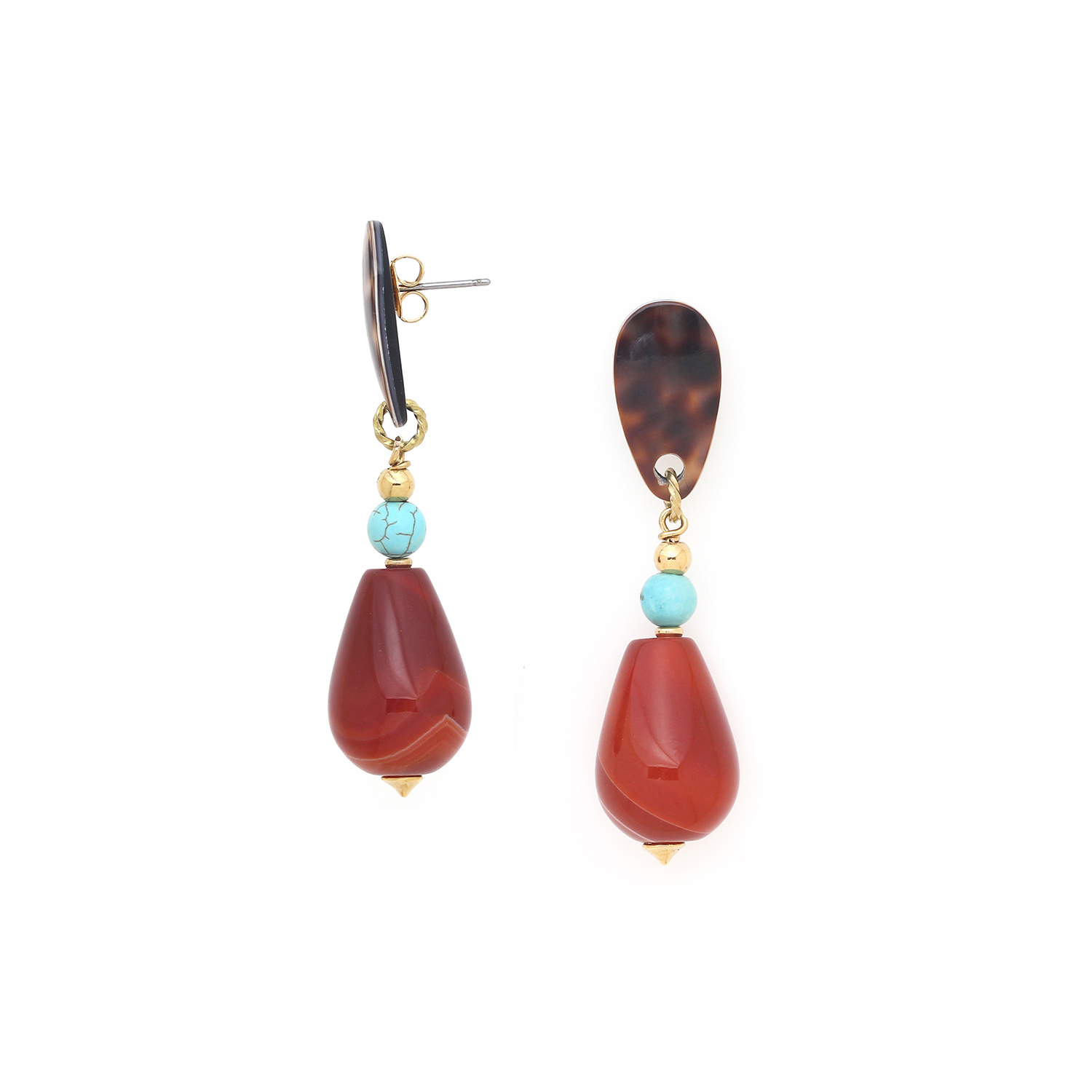 ფრანგული ბრენდი Nature Bijoux ს ხელნაკეთი საყურე, კოლექციიდან SURABAYA. სამკაულის ბაზად გამოყენებულია თითბერი, კოლექციაში გამოყენებული ნატურალური მასალები და ქვები: წითელი აგატი, ჰუალიტი, ზღვის ლოკოკინა, თითბერი.