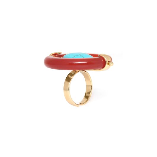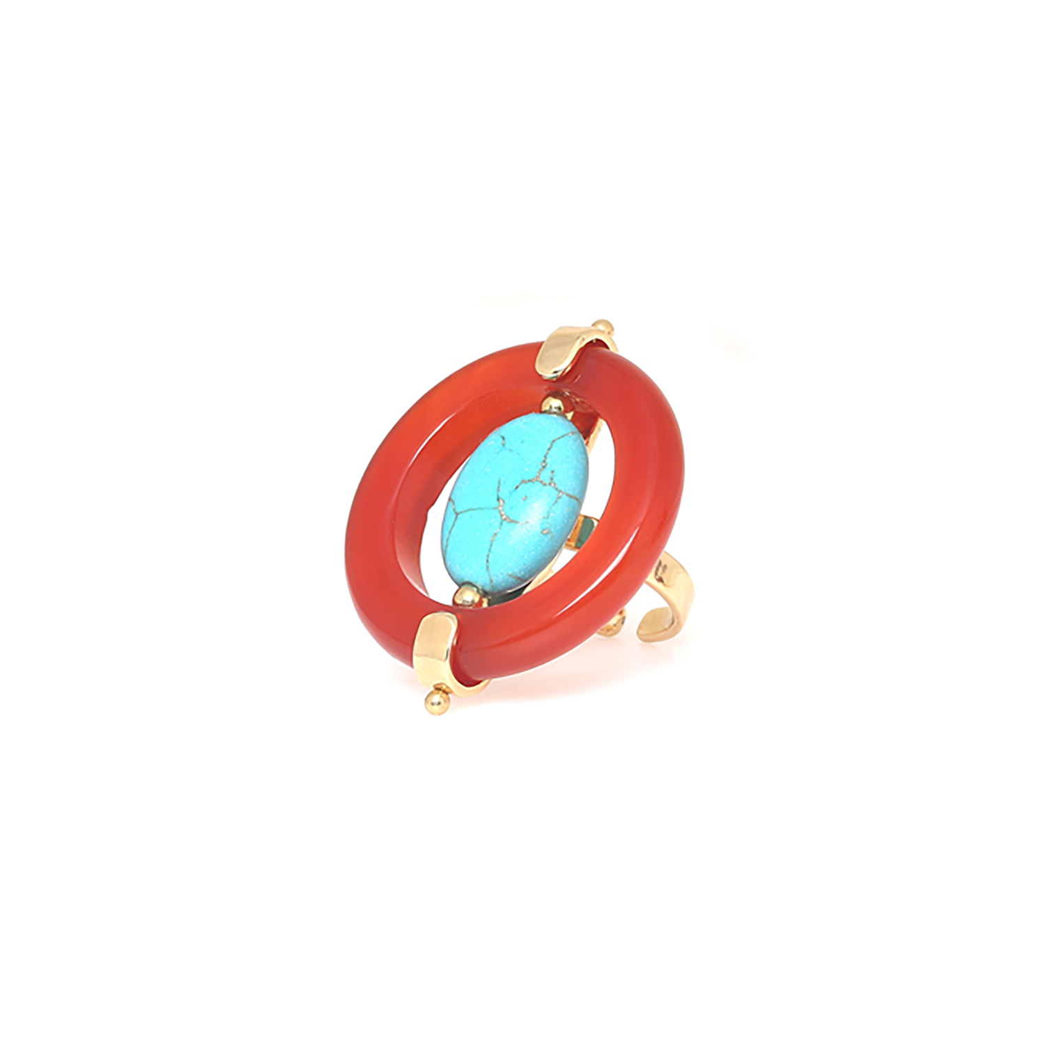 ფრანგული ბრენდი Nature Bijoux ს ხელნაკეთი ბეჭედი, კოლექციიდან SURABAYA. სამკაულის ბაზად გამოყენებულია თითბერი, კოლექციაში გამოყენებული ნატურალური მასალები და ქვები: წითელი აგატი, ჰუალიტი, ზღვის ლოკოკინა, თითბერი.