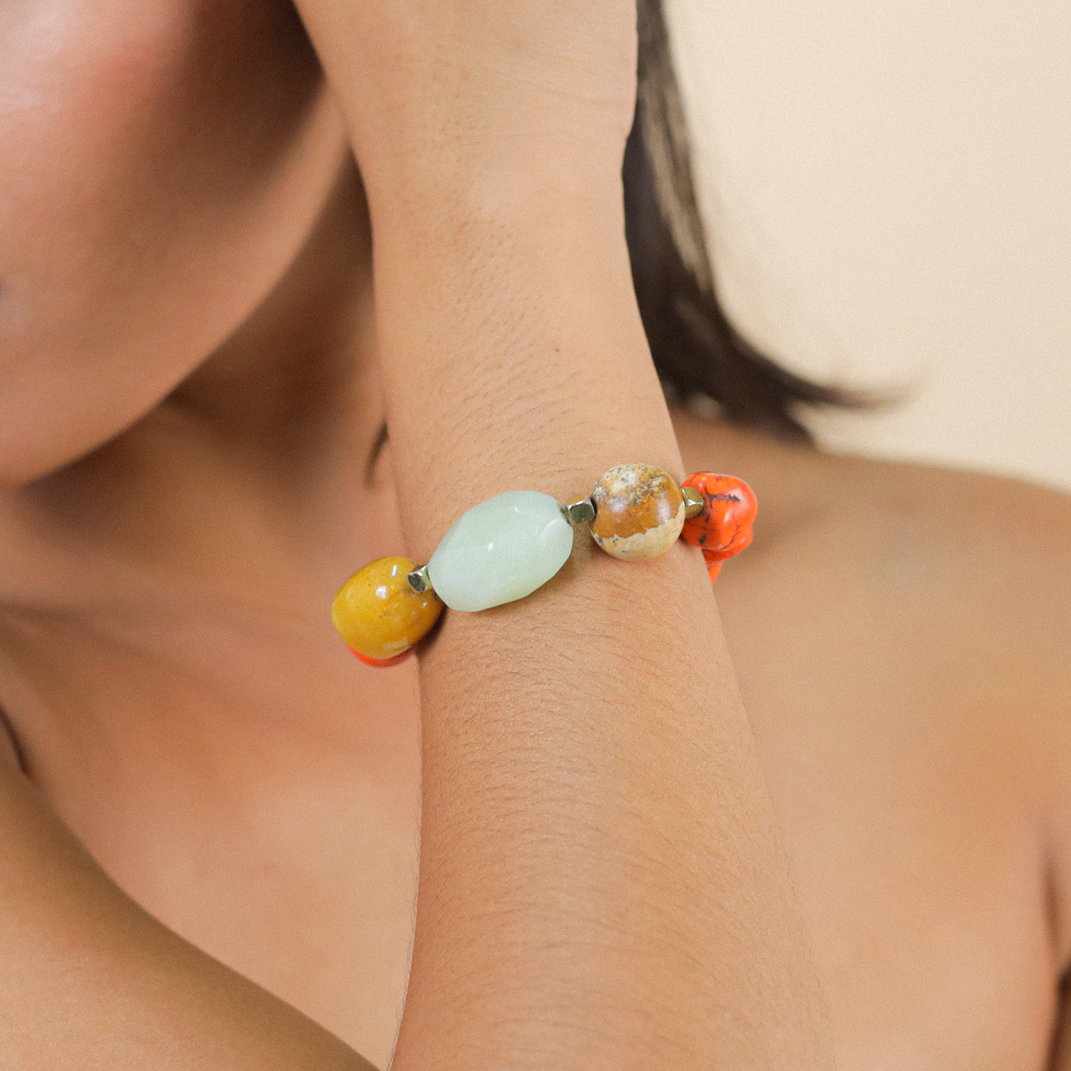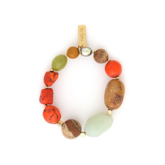ფრანგული ბრენდი Nature Bijoux ს ხელნაკეთი სამაჯური, კოლექციიდან TIVOLI. სამკაულის ბაზად გამოყენებულია თითბერი, კოლექციაში გამოყენებული ნატურალური მასალები და ქვები: ყავისფერი სადაფი, მარგალიტი, ჰუალიტი, ნეფრიტი, იასპი, ყავისფერი იასპი, ვეფხვის თვალი, თითბერი.