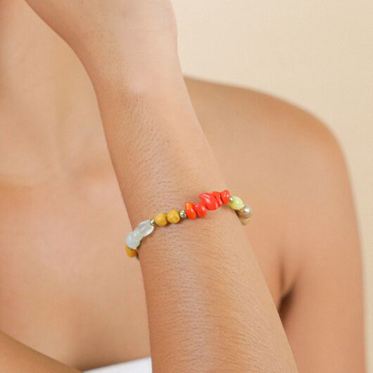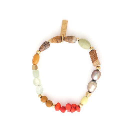 ფრანგული ბრენდი Nature Bijoux ს ხელნაკეთი სამაჯური, კოლექციიდან TIVOLI. სამკაულის ბაზად გამოყენებულია თითბერი, კოლექციაში გამოყენებული ნატურალური მასალები და ქვები: ყავისფერი სადაფი, მარგალიტი, ჰუალიტი, ნეფრიტი, იასპი, ყავისფერი იასპი, ვეფხვის თვალი, თითბერი.