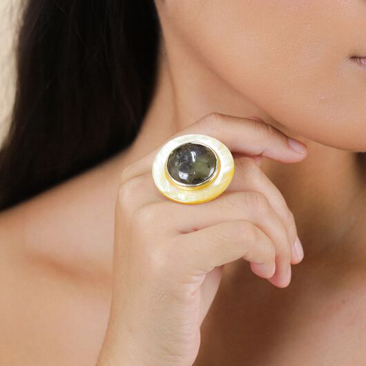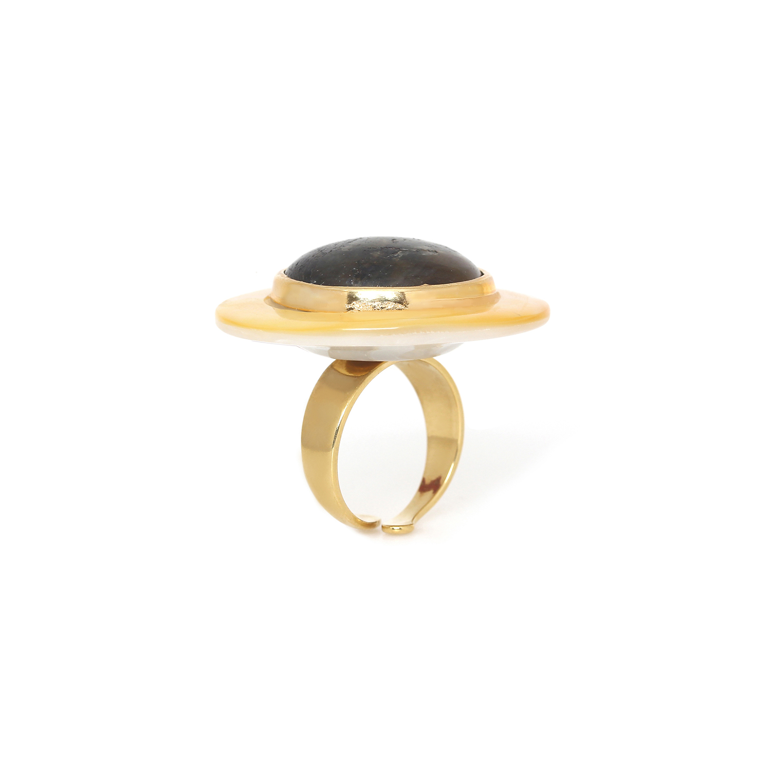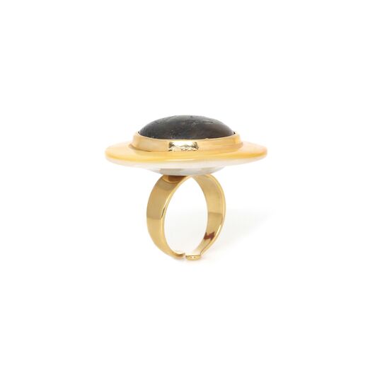 ფრანგული ბრენდი Nature Bijoux ს ხელნაკეთი ბეჭედი, კოლექციიდან ECLIPSE. სამკაულის ბაზად გამოყენებულია თითბერი, კოლექციაში გამოყენებული ნატურალური მასალები და ქვები: ნაცრისფერი აბანოზის ხე, ლაბრადორიტი, ოქროსფერი სადაფი.
