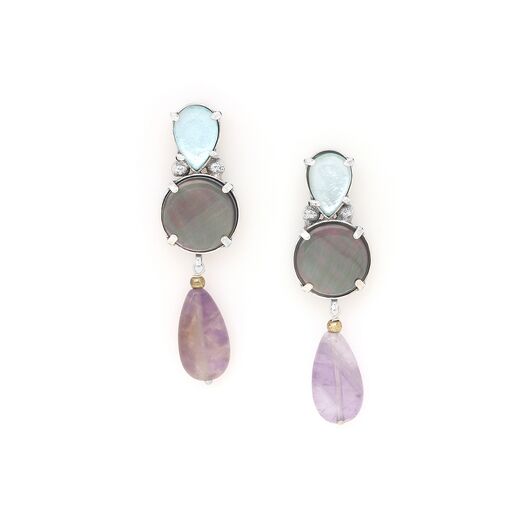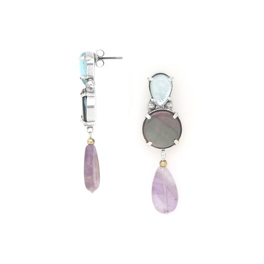 ფრანგული ბრენდი Nature Bijoux ს ხელნაკეთი საყურე, კოლექციიდან GOTBORG. სამკაულის ბაზად გამოყენებულია თითბერი, კოლექციაში გამოყენებული ნატურალური მასალები და ქვები: ამეთვისტო, აქვამარინი, ფალავნის მარგალიტი, ხამანცკის ნიჟარა, ძოწი, დამუშავებული მინა, კიანიტი.