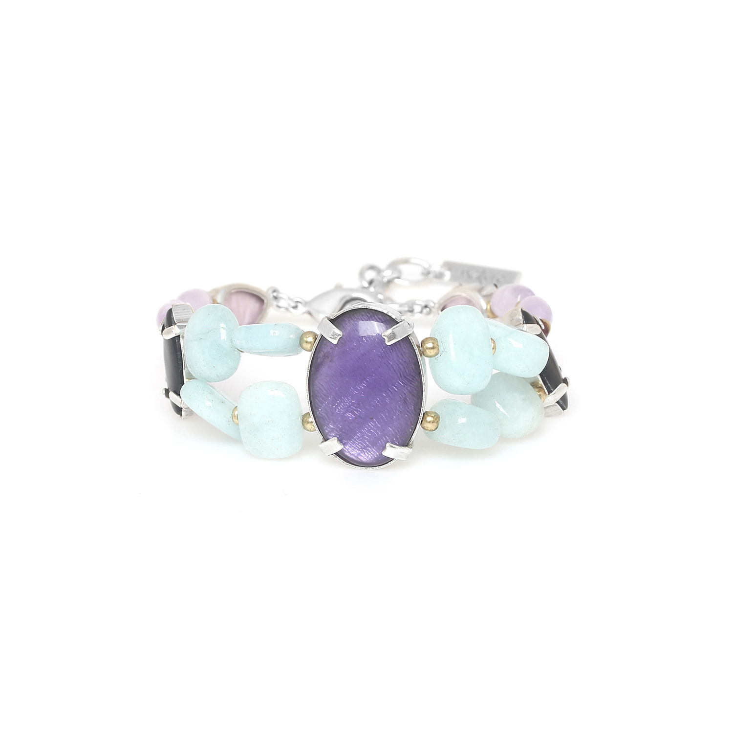 ფრანგული ბრენდი Nature Bijoux ს ხელნაკეთი სამაჯური, კოლექციიდან GOTBORG. სამკაულის ბაზად გამოყენებულია თითბერი, კოლექციაში გამოყენებული ნატურალური მასალები და ქვები: ამეთვისტო, აქვამარინი, ფალავნის მარგალიტი, ხამანცკის ნიჟარა, ძოწი, დამუშავებული მინა, კიანიტი.