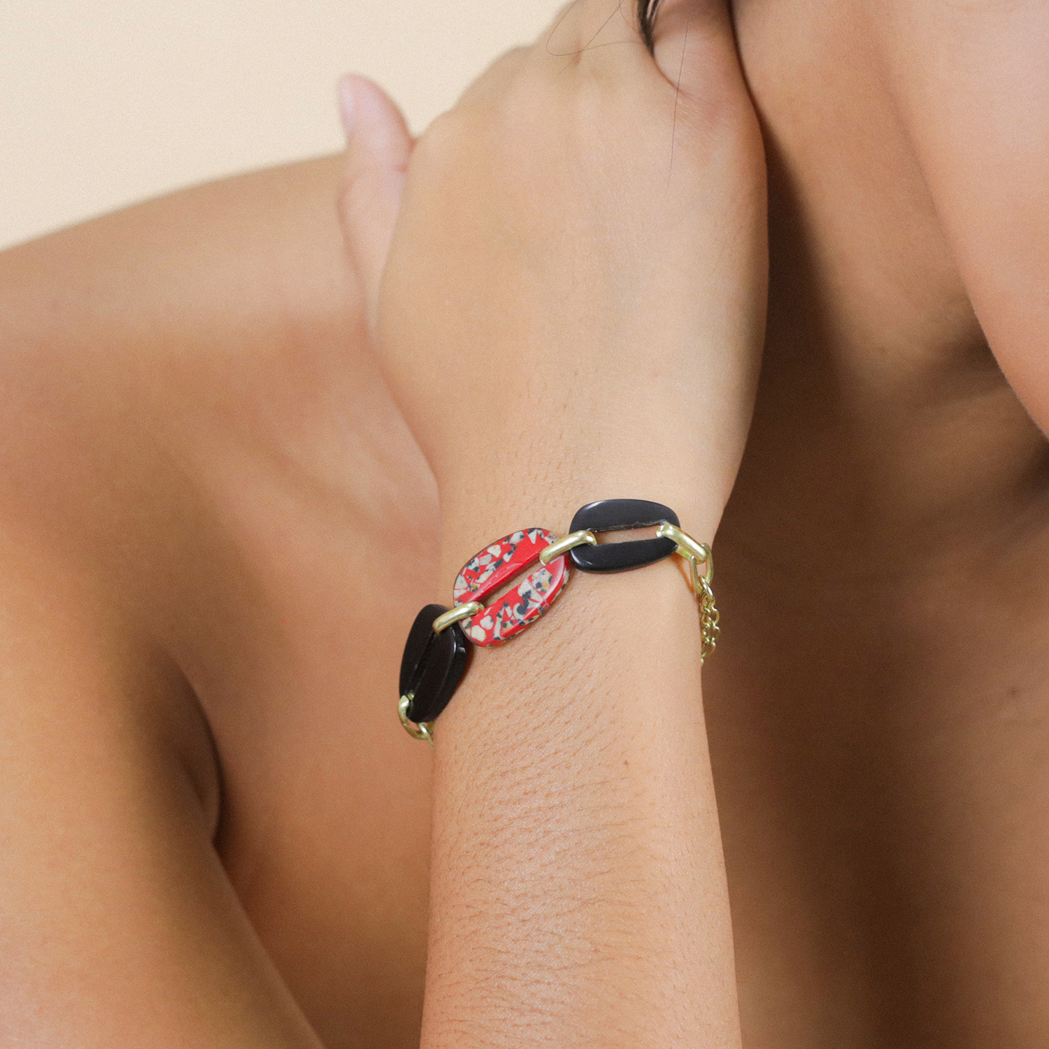 ფრანგული ბრენდი Nature Bijoux ს ხელნაკეთი სამაჯური, კოლექციიდან SICILIA. სამკაულის ბაზად გამოყენებულია თითბერი, კოლექციაში გამოყენებული ნატურალური მასალები და ქვები: რქა , ლაქებიანი იასპი.