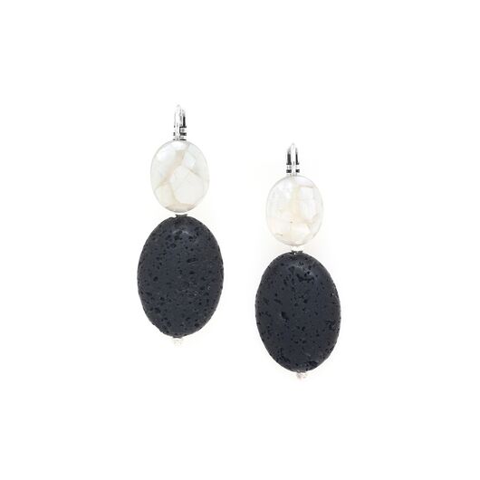 ფრანგული ბრენდი Nature Bijoux ს ხელნაკეთი საყურე, კოლექციიდან VOLCAN. სამკაულის ბაზად გამოყენებულია თითბერი, კოლექციაში გამოყენებული ნატურალური მასალები და ქვები: რქა, ლავის ქვა, თეთრი სადაფი.