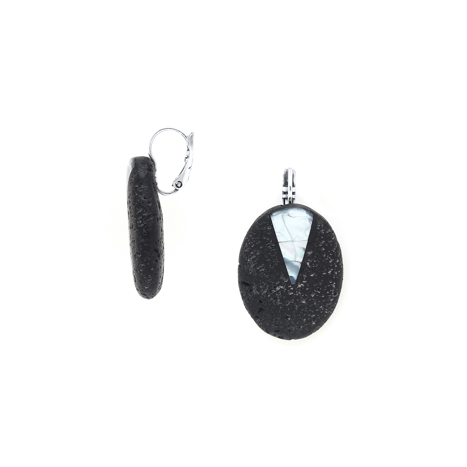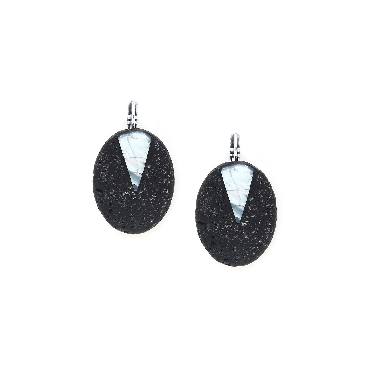 ფრანგული ბრენდი Nature Bijoux ს ხელნაკეთი საყურე, კოლექციიდან VOLCAN. სამკაულის ბაზად გამოყენებულია თითბერი, კოლექციაში გამოყენებული ნატურალური მასალები და ქვები: რქა, ლავის ქვა, თეთრი სადაფი.