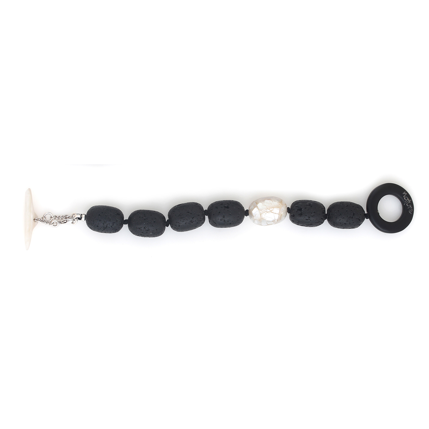 ფრანგული ბრენდი Nature Bijoux ს ხელნაკეთი სამაჯური, კოლექციიდან VOLCAN. სამკაულის ბაზად გამოყენებულია თითბერი, კოლექციაში გამოყენებული ნატურალური მასალები და ქვები: რქა, ლავის ქვა, თეთრი სადაფი.