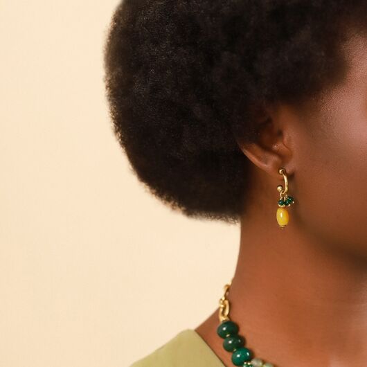 ფრანგული ბრენდი Nature Bijoux ს ხელნაკეთი საყურე, კოლექციიდან AGATA VERDE. სამკაულის ბაზად გამოყენებულია თითბერი, კოლექციაში გამოყენებული ნატურალური მასალები და ქვები: აგატი, ნეფრიტი, ავანტურინი.