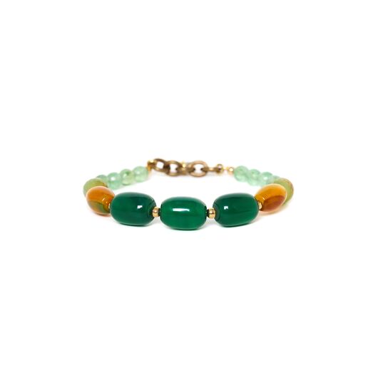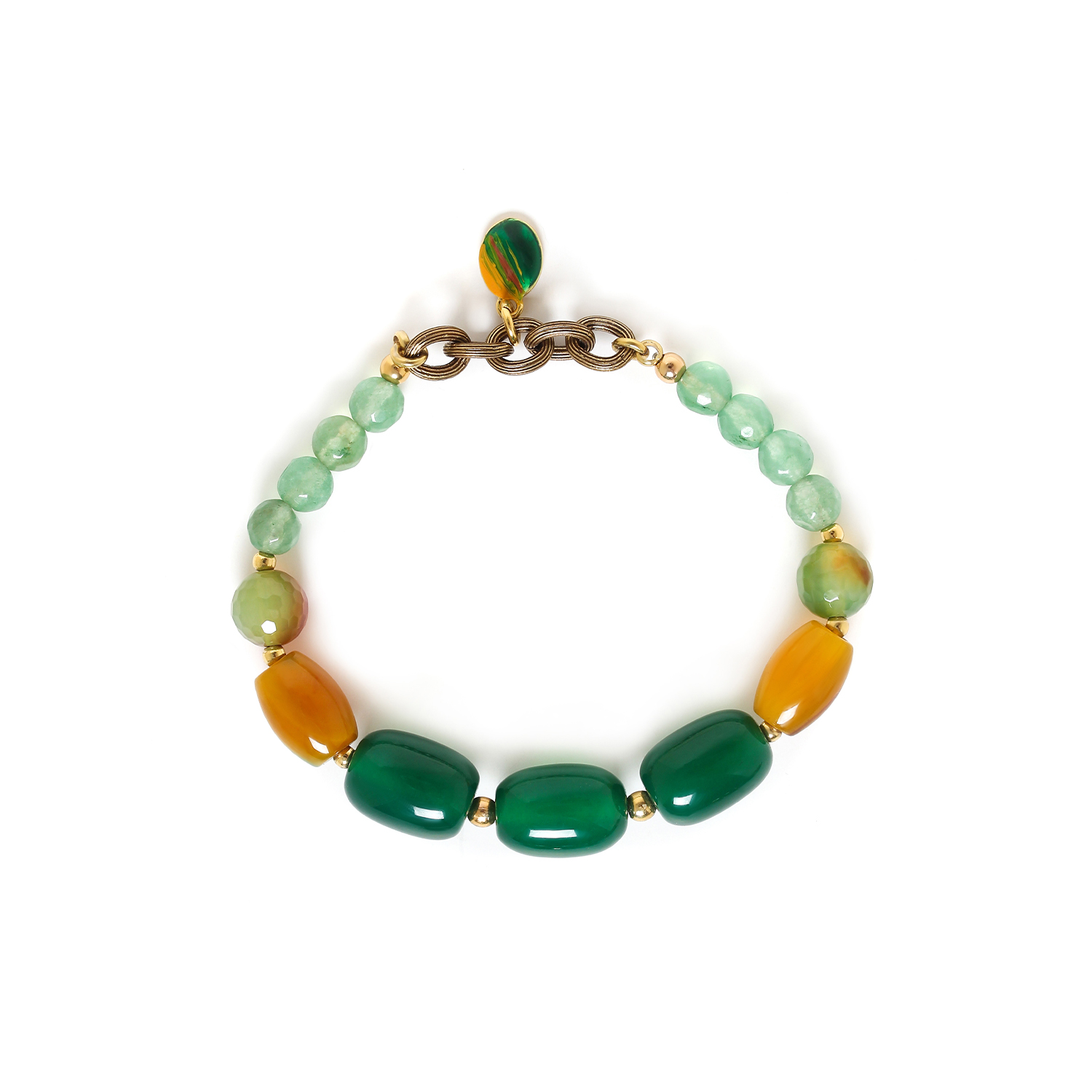 ფრანგული ბრენდი Nature Bijoux ს ხელნაკეთი სამაჯური, კოლექციიდან AGATA VERDE. სამკაულის ბაზად გამოყენებულია თითბერი, კოლექციაში გამოყენებული ნატურალური მასალები და ქვები: აგატი, ნეფრიტი, ავანტურინი.