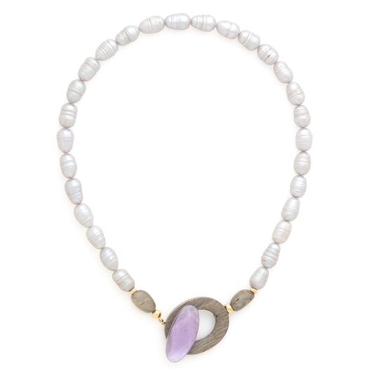 ფრანგული ბრენდი Nature Bijoux ს ხელნაკეთი ყელსაბამი, კოლექციიდან LAVENDER. სამკაულის ბაზად გამოყენებულია თითბერი, კოლექციაში გამოყენებული ნატურალური მასალები და ქვები: დამუშავებული მინა, ბამბის ძაფი, მარგალიტი, ნაცრისფერი აბაზონის ხე, ლაბრადორიტი, თითბერი.