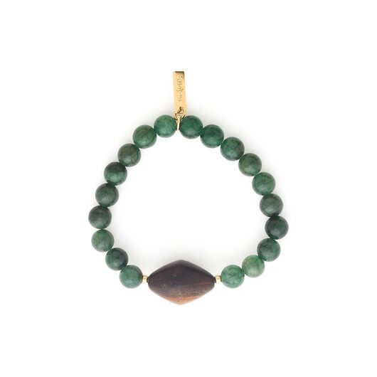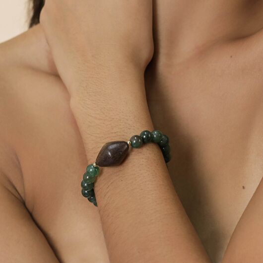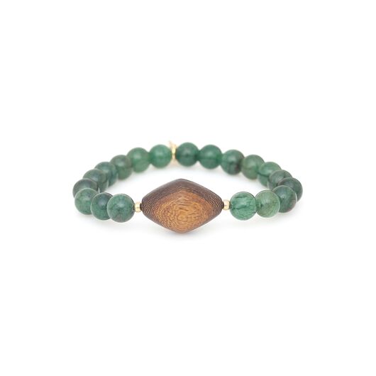 ფრანგული ბრენდი Nature Bijoux ს ხელნაკეთი სამაჯური, კოლექციიდან AVENTURINE. სამკაულის ბაზად გამოყენებულია თითბერი, კოლექციაში გამოყენებული ნატურალური მასალები და ქვები: კალიფორნიული თეთრი მუხა, მწვანე ავანტიურინი.